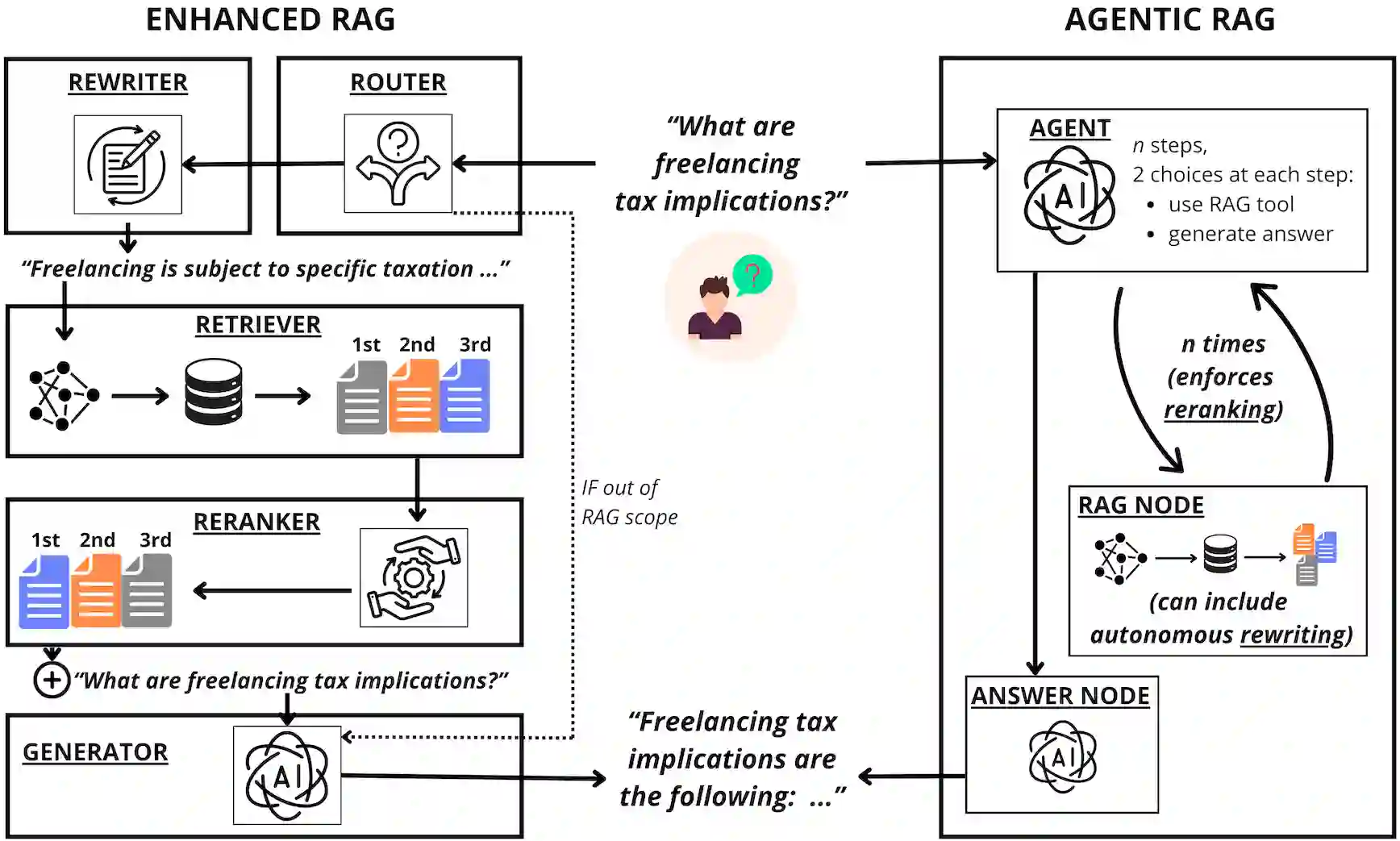 翻译:检索增强生成(RAG)系统通常由生成器与检索组件结合定义,后者从知识库中提取文本上下文以回答用户查询。然而,此类基础实现存在若干局限,包括检索结果噪声大或次优、对超出范围查询的检索误用、查询与文档匹配能力弱,以及生成器本身的波动性或成本问题。这些缺陷推动了"增强型"RAG的发展,即通过引入专用模块来应对工作流中的特定弱点。近年来,大型语言模型(LLMs)日益增强的自反思能力催生了一种新范式,我们称之为"智能体式"RAG。该方法由LLM统筹整个流程——决定执行何种操作、何时执行以及是否迭代——从而减少对固定人工设计模块的依赖。尽管这两种范式已迅速得到应用,但在何种条件下何种方法更具优势仍不明确。本研究通过多场景、多维度的实证评估,对增强型与智能体式RAG进行了全面比较。实验结果揭示了两种范式间的权衡关系,为实际应用中综合考虑成本与性能选择最优RAG设计方案提供了实践指导。