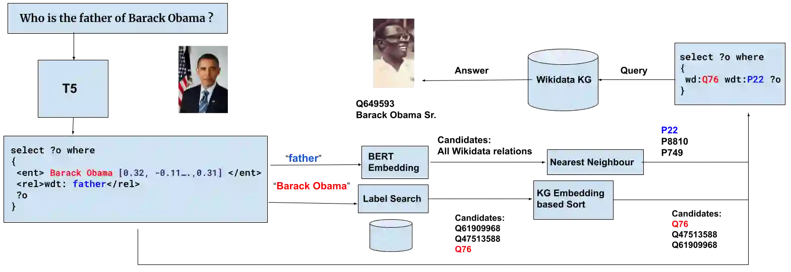 在本文中,我们提出了一种名为GETT-QA的端到端知识图问答系统。GETT-QA使用T5,一种流行的文本到文本预训练语言模型。该模型以自然语言的形式接受问题作为输入,并生成简化形式的预期SPARQL查询。在简化形式中,该模型不直接生成实体和关系ID,而是生成相应的实体和关系标签。标签在随后的步骤中与KG实体和关系ID相结合。为了进一步改善结果,我们指导该模型生成每个实体的KG嵌入的截断版本。截断KG嵌入使细化搜索用于消歧。我们发现,T5能够在不改变损失函数的情况下学习截断的KG嵌入,从而提高了KGQA的性能。因此,我们在Wikidata的LC-QuAD 2.0和SimpleQuestions-Wikidata数据集上报告了端到端KGQA的强大结果。