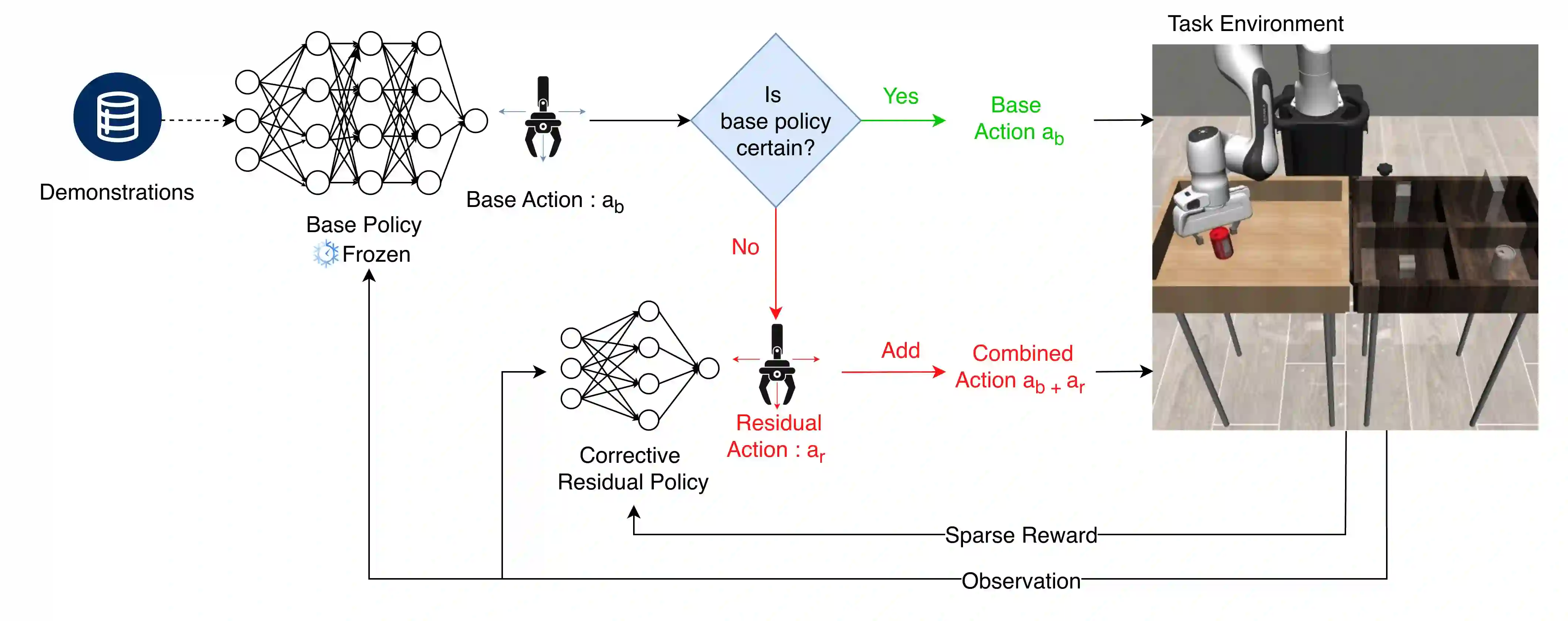 Residual Reinforcement Learning (RL) is a popular approach for adapting pretrained policies by learning a lightweight residual policy that provides corrective actions. While Residual RL is more sample-efficient than finetuning the entire base policy, existing methods struggle with sparse rewards and are designed for deterministic base policies. We propose two improvements to Residual RL that further enhance its sample efficiency and make it suitable for stochastic base policies. First, we leverage uncertainty estimates of the base policy to focus exploration on regions in which the base policy is not confident. Second, we propose a simple modification to off-policy residual learning that allows it to observe base actions and better handle stochastic base policies. We evaluate our method with both Gaussian-based and Diffusion-based stochastic base policies on tasks from Robosuite and D4RL, and compare against state-of-the-art finetuning methods, demo-augmented RL methods, and other residual RL methods. Our algorithm significantly outperforms existing baselines in a variety of simulation benchmark environments. We also deploy our learned polices in the real world to demonstrate their robustness with zero-shot sim-to-real transfer. Paper homepage : lakshitadodeja.github.io/uncertainty-aware-residual-rl/