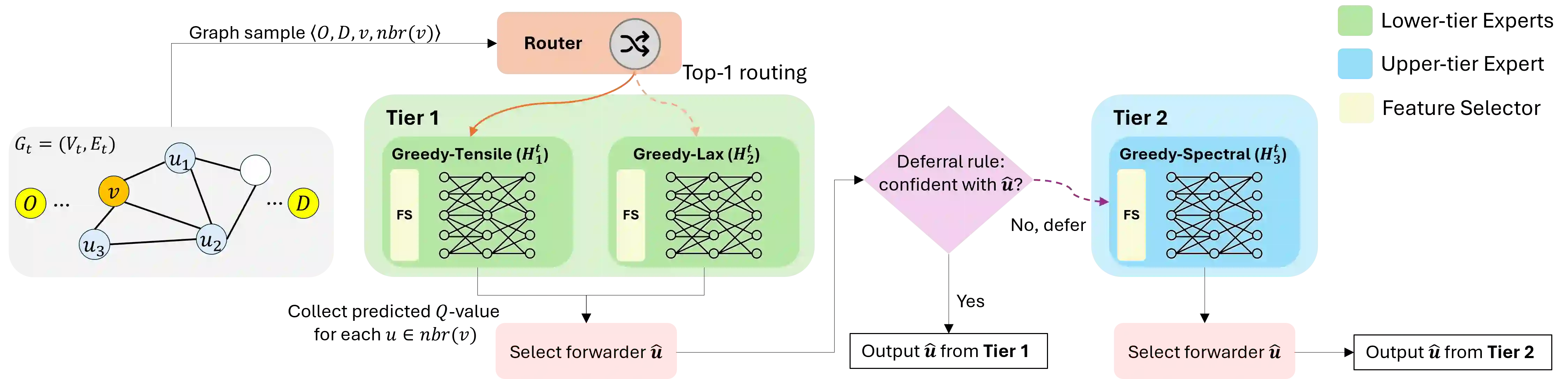 翻译:尽管利用局部特征的深度学习模型在稠密欧几里得图中已展现出实现近最优路由的巨大潜力,但在拓扑结构不规则、需要更广泛结构感知的稀疏网络中,其泛化能力往往不足。为应对这一局限,我们训练了一个级联专家混合模型来解决全节点对近最短路径路由问题。我们的级联专家混合模型采用模块化的双层架构,支持转发节点选择的决策制定:下层专家依赖局部特征,而上层专家依赖全局特征。该模型执行自适应推理,仅当下层专家不足以达成足够决策质量时,才会触发上层专家。由此,模型能力仅在拓扑复杂性需要时才被提升,从而实现了计算效率,并避免了参数冗余。此外,我们引入了一种在线元学习策略,该策略便于专家独立微调,并采用一种侧重于稳定性的更新机制,以防止在遇到新图环境时发生灾难性遗忘。实验评估表明,与单专家基线模型相比,级联专家混合路由在稀疏网络中的准确率最高可提升29.1%,并且在不同的图密度下,其性能均能维持在理论上限的1%-6%以内。