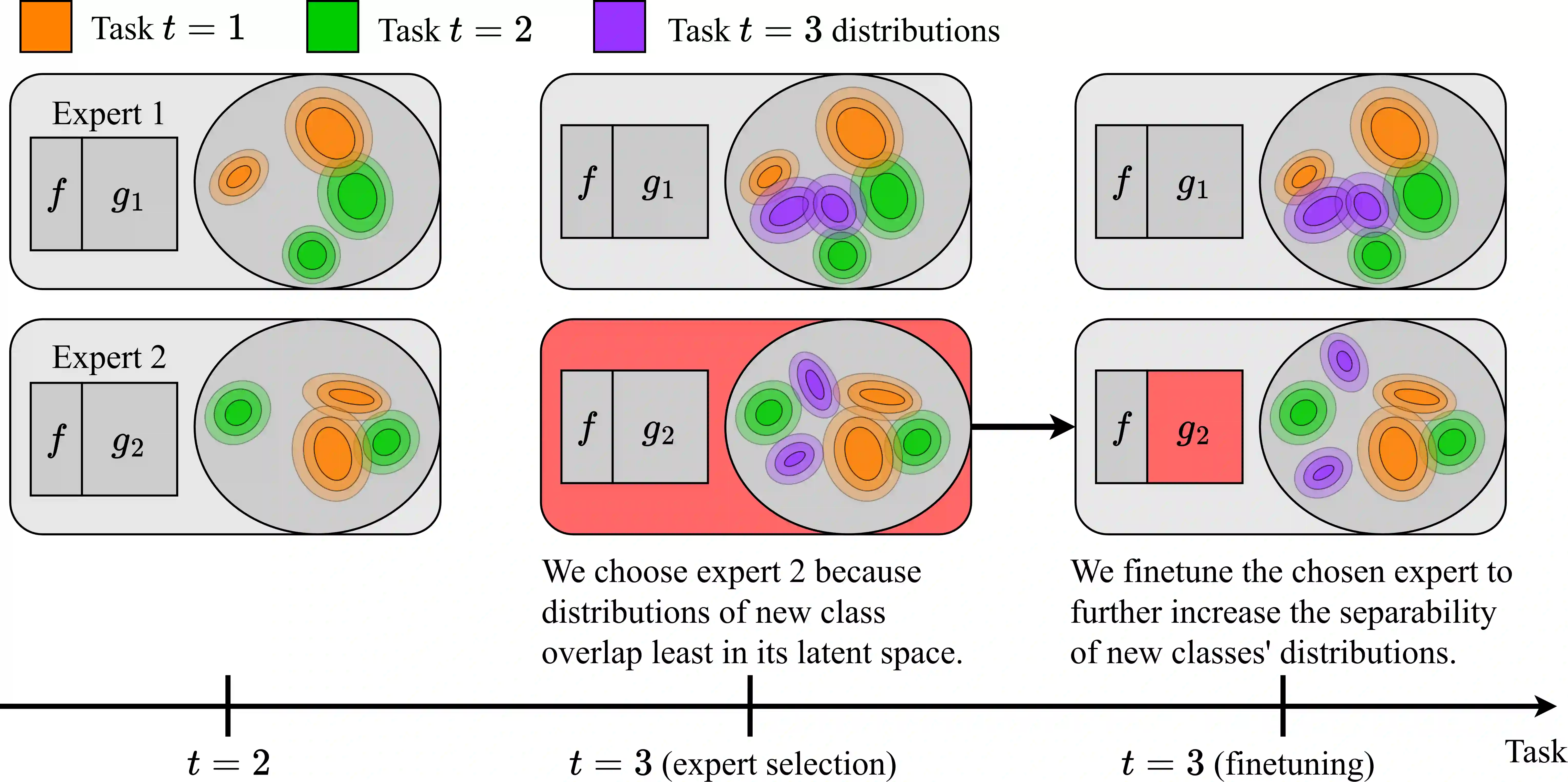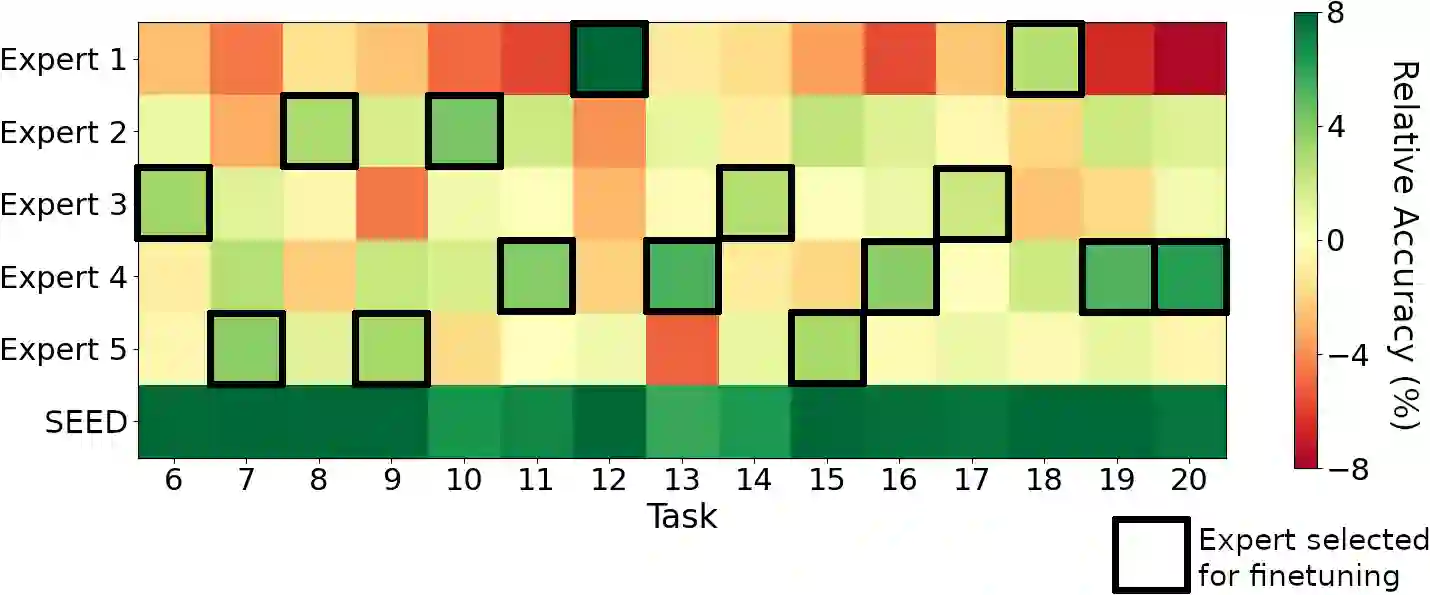 Class-incremental learning is becoming more popular as it helps models widen their applicability while not forgetting what they already know. A trend in this area is to use a mixture-of-expert technique, where different models work together to solve the task. However, the experts are usually trained all at once using whole task data, which makes them all prone to forgetting and increasing computational burden. To address this limitation, we introduce a novel approach named SEED. SEED selects only one, the most optimal expert for a considered task, and uses data from this task to fine-tune only this expert. For this purpose, each expert represents each class with a Gaussian distribution, and the optimal expert is selected based on the similarity of those distributions. Consequently, SEED increases diversity and heterogeneity within the experts while maintaining the high stability of this ensemble method. The extensive experiments demonstrate that SEED achieves state-of-the-art performance in exemplar-free settings across various scenarios, showing the potential of expert diversification through data in continual learning.