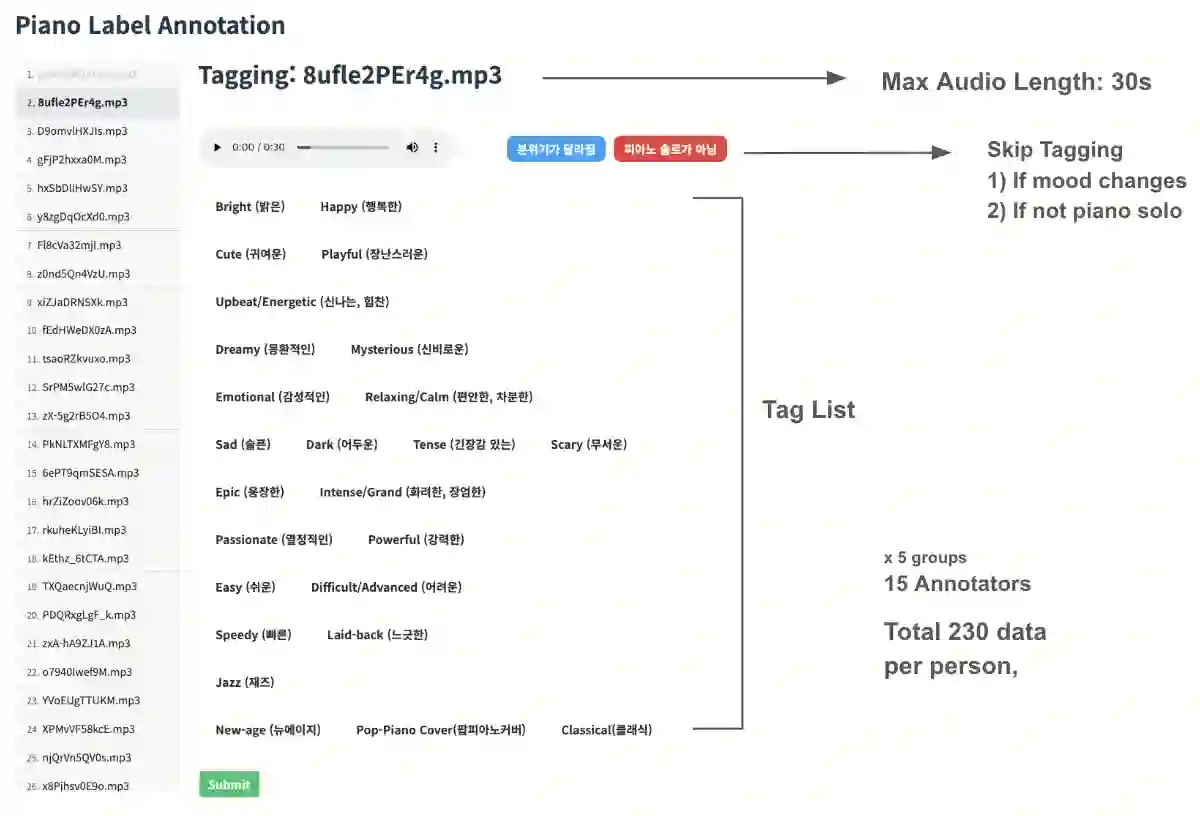 翻译:尽管钢琴音乐已成为音乐信息检索领域的重要研究对象,但目前仍缺乏带有文本标注的钢琴独奏音乐数据集。为填补这一空白,我们提出了PIAST(包含音频、符号与文本的钢琴数据集)。基于钢琴专用的语义标签分类体系,我们从YouTube收集了9,673条音轨,并由音乐专家对其中2,023条音轨进行了人工标注,最终形成两个子集:PIAST-YT与PIAST-AT。两个子集均包含音频、文本、标签标注,并采用最先进的钢琴转录与节拍追踪模型生成了MIDI转录数据。基于该多模态数据集可开展的众多任务中,我们利用音频与MIDI数据进行了音乐标签分类与检索实验,并报告了基线性能,以证明其作为音乐信息检索研究资源的潜在价值。