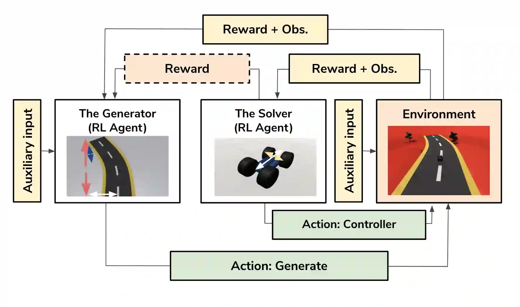 翻译:我们提出了一个程序内容生成方法,并通过使用对抗性深度RL来改进强化学习(RL)代理物的普及,从而改进强化学习(RL)代理物的普及,这是一个臭名昭著的困难任务。培训RL代理物对新环境进行普及化培训是一种流行的方法,在程序上创造不同的环境,以提高受过训练的代理物的通用性。我们在这里采用了一个带有PCG RL代理物(所谓的发电机)和一个解决RL代理物(称为Solverer)的对抗性模式。其好处主要有两个方面:首先,解决器通过生成发电机产生的挑战,更好地实现强化学习(RLL)的普及化。第二,受过训练的发电机可以用作创造新环境的创造者,这些新环境与解决器一起,可以证明是可溶解的。根据溶剂的性能产生一种奖励信号,鼓励环境设计具有挑战性,但并非不可能。为了进一步推动环境生成的多样化和控制,我们建议使用辅助性投入物(称为Solverger)。因此,我们建议对程序内容生成采用对抗性RLPG,这是一种在程序上产生程序上创造的对抗性环境,在程序上产生一种程序上产生一种可视环境,在程序上产生一种辅助性的环境,在程序上产生一种辅助性的投入投入物,可以与辅助性的投入性投入物作比较,将它作为新的概念的比较为一种可变式。我们在这里将它作为新的环境的比较。我们用的方法,用的方法,这里将这种解释。我们将这种解释式地描述为一种可比较,将它作为新的方法,将它作为新的环境的比较。