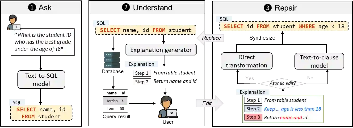 Relational databases play an important role in this Big Data era. However, it is challenging for non-experts to fully unleash the analytical power of relational databases, since they are not familiar with database languages such as SQL. Many techniques have been proposed to automatically generate SQL from natural language, but they suffer from two issues: (1) they still make many mistakes, particularly for complex queries, and (2) they do not provide a flexible way for non-expert users to validate and refine the incorrect queries. To address these issues, we introduce a new interaction mechanism that allows users directly edit a step-by-step explanation of an incorrect SQL to fix SQL errors. Experiments on the Spider benchmark show that our approach outperforms three SOTA approaches by at least 31.6% in terms of execution accuracy. A user study with 24 participants further shows that our approach helped users solve significantly more SQL tasks with less time and higher confidence, demonstrating its potential to expand access to databases, particularly for non-experts.