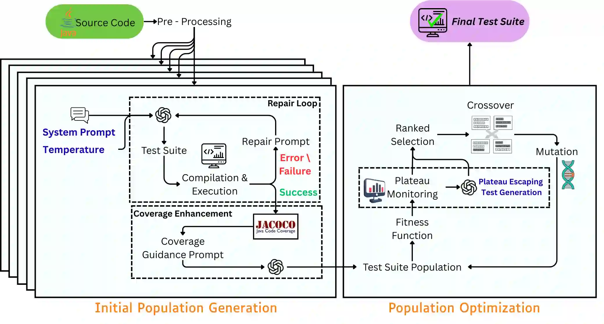 翻译:基于搜索的软件测试(SBST)是一种成熟的自动化单元测试生成方法,但其生成的测试套件常面临早熟收敛和多样性受限的问题。近期,大型语言模型(LLMs)已成为单元测试生成的替代技术。本文提出EvoGPT,一种融合基于LLM的测试生成与基于SBST的测试套件优化的混合测试生成系统。EvoGPT使用LLMs生成初始测试套件种群,并采用进化算法(EA)对该种群进行进一步优化。EvoGPT的显著特征是通过在测试生成阶段使用多温度参数和多样化提示指令,显式地增强多样性。此外,每个LLM生成的测试均通过生成-修复循环和覆盖率引导的断言生成进行精炼。针对进化停滞问题,EvoGPT在搜索过程中检测平台期,并注入针对先前未覆盖分支的额外LLM生成测试。此过程同样通过多温度参数和提示指令强制保持多样性。我们在测试生成标准基准Defects4J上评估EvoGPT。实验结果表明,相较于纯LLM基线TestART和标准SBST基线EvoSuite,EvoGPT在代码覆盖率和变异分数指标上平均提升10%。消融研究表明,在初始化和搜索过程中显式增强多样性,是有效利用LLMs进行自动化单元测试生成的关键。