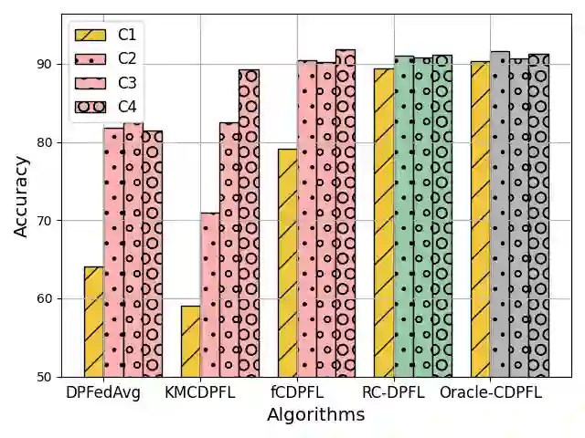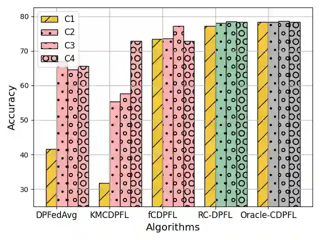 Federated Learning (FL) is a decentralized machine learning (ML) approach that keeps data localized and often incorporates Differential Privacy (DP) to enhance privacy guarantees. Similar to previous work on DP in ML, we observed that differentially private federated learning (DPFL) introduces performance disparities, particularly affecting minority groups. Recent work has attempted to address performance fairness in vanilla FL through clustering, but this method remains sensitive and prone to errors, which are further exacerbated by the DP noise in DPFL. To fill this gap, in this paper, we propose a novel clustered DPFL algorithm designed to effectively identify clients' clusters in highly heterogeneous settings while maintaining high accuracy with DP guarantees. To this end, we propose to cluster clients based on both their model updates and training loss values. Our proposed approach also addresses the server's uncertainties in clustering clients' model updates by employing larger batch sizes along with Gaussian Mixture Model (GMM) to alleviate the impact of noise and potential clustering errors, especially in privacy-sensitive scenarios. We provide theoretical analysis of the effectiveness of our proposed approach. We also extensively evaluate our approach across diverse data distributions and privacy budgets and show its effectiveness in mitigating the disparate impact of DP in FL settings with a small computational cost.