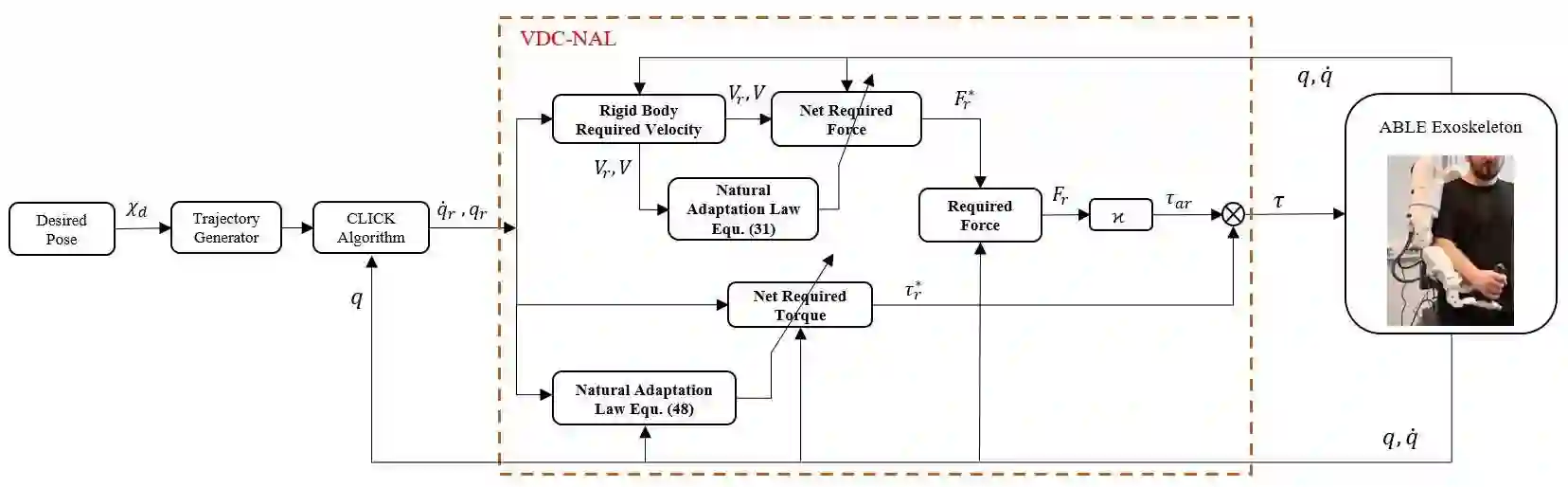 翻译:这项工作的目的是使用一种适应性分散控制方法,称为虚拟分解控制(VDC),以控制7度自由(DoF)右手右上升升平exoskeleton7度自由(DoF)的终效器的方向和位置。现行适应性VDC方法要求调整13n的适应收益和26n的上下参数界限,其中n为硬体体数。因此,利用VDC计划控制高度DoF机器人,如7度多佛上升平流外向骨骼(VDC),可能是一项艰巨的任务。在本文中,采用了一种新的适应功能,即所谓的自然适应法(NAL),以消除VDC的这些负担,从而将所有13度收益减少到1度,并消除对上下界限的依赖。为此,VDC的动态方程式进行了调整,惯性参数矢量与NAL兼容。然后,NAL适应功能被用来设计一个新的适应性VDC计划。这种新型适应性VDC方法确保了估计参数的物理一致性条件,而无需对上下限和下限的虚拟适应性法律概念。最后证明,VDC的拟议的适应性功能是已加以利用的。