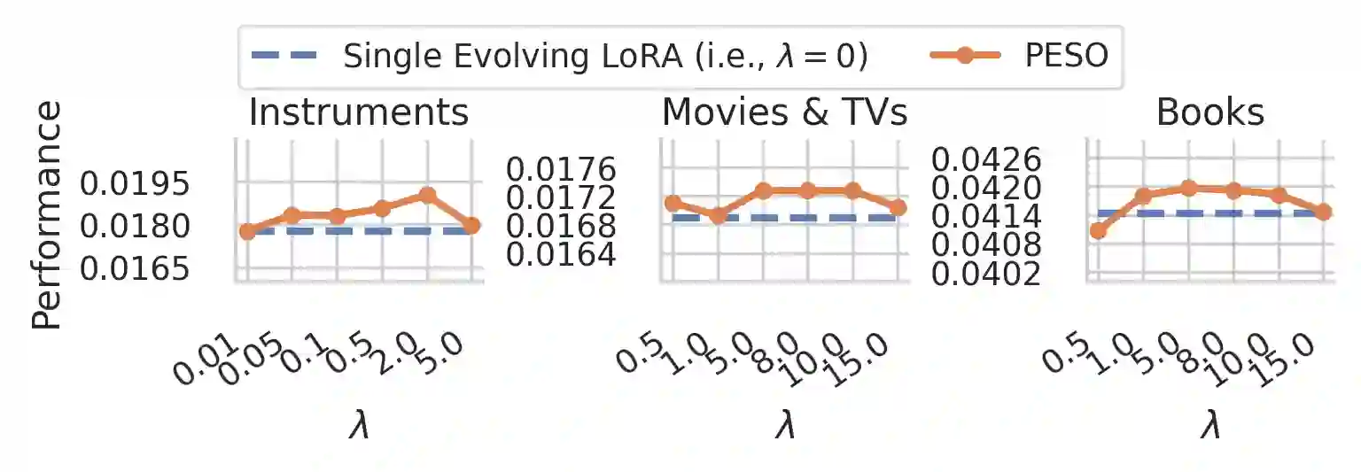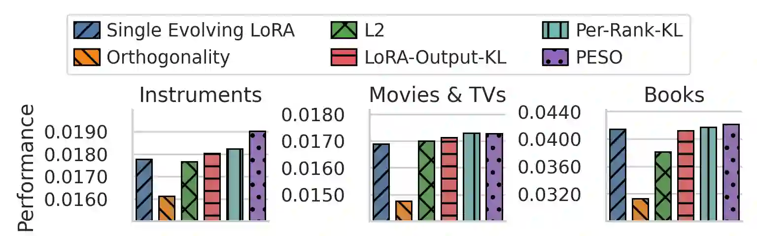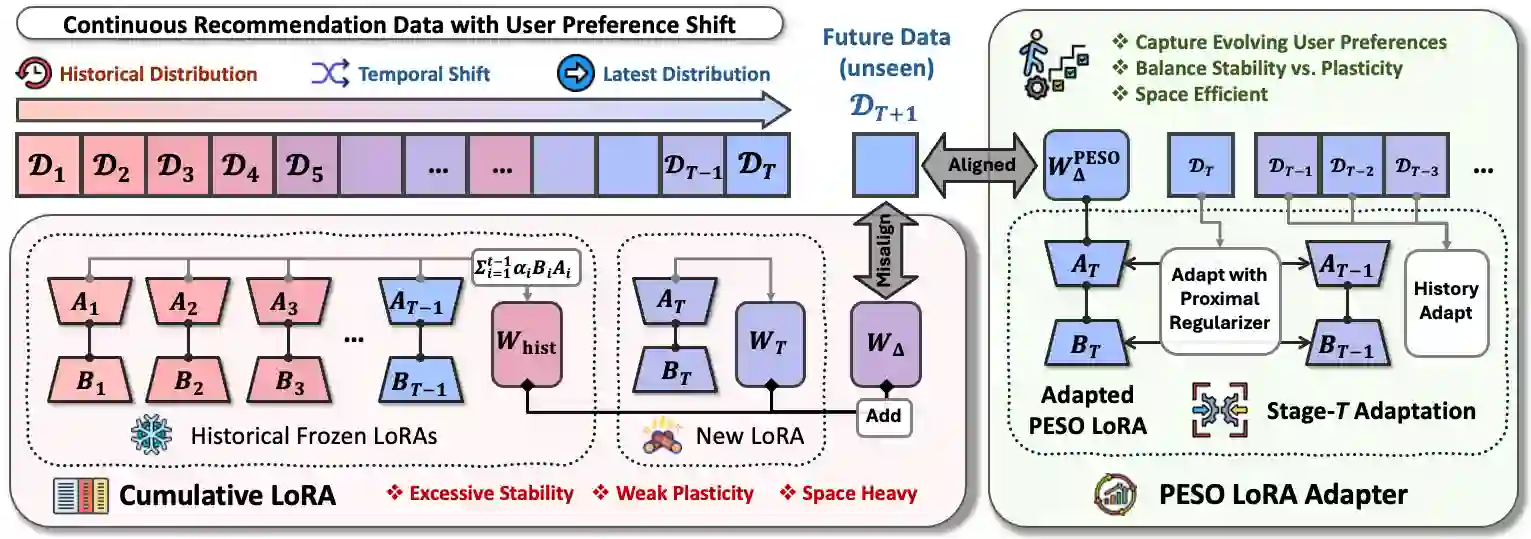 翻译:尽管大型语言模型(LLM)在推荐任务中表现出色,但随着用户、物品及用户偏好随时间演变,它们在持续学习方面面临挑战。现有的基于LoRA的持续学习方法主要侧重于保持先前任务上的性能,但这忽略了推荐任务的独特性质:其目标并非预测过去的偏好,且当当前兴趣发生显著变化时,过时的偏好甚至可能损害性能。为解决这一问题,我们提出PESO(邻近正则化单演化LoRA),一种用于推荐场景中LoRA的持续适配方法。PESO引入了一个邻近正则化器,将当前适配器锚定在其最近冻结的状态上,使模型能够灵活平衡适应与保留,并更好地捕捉近期的用户行为。理论上,我们证明这种邻近设计在LoRA子空间中提供了数据感知的、方向性的指导。实证结果表明,PESO在性能上持续优于现有的基于LoRA的持续学习方法。