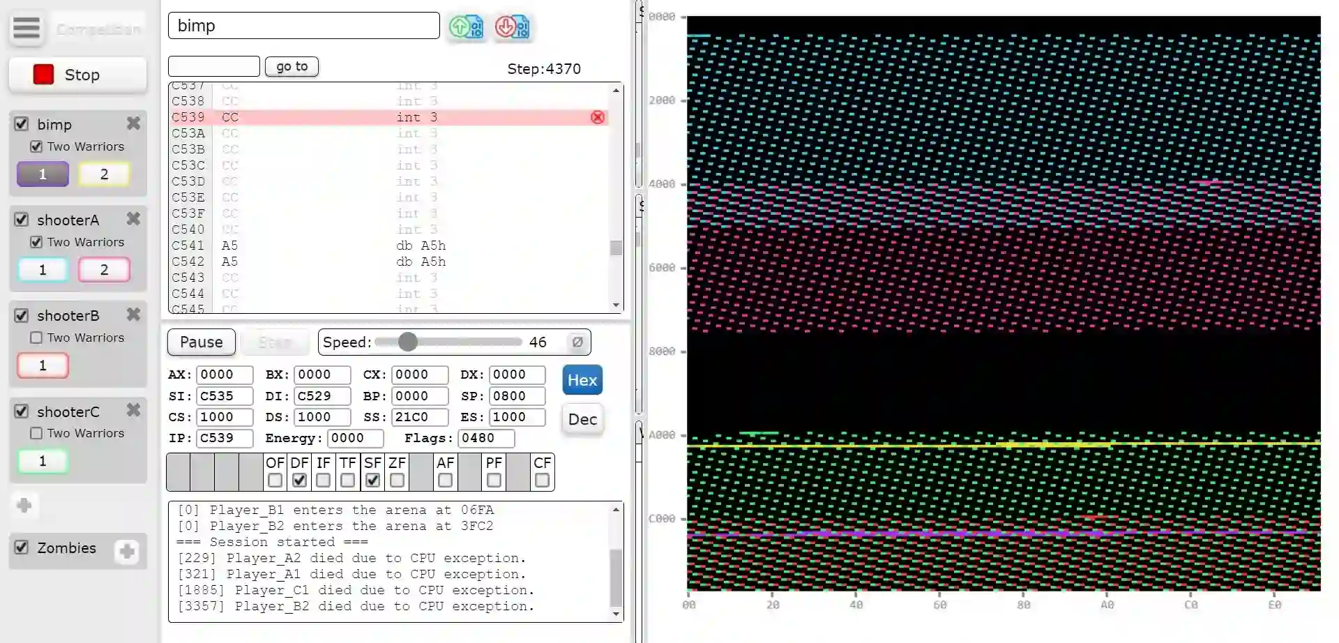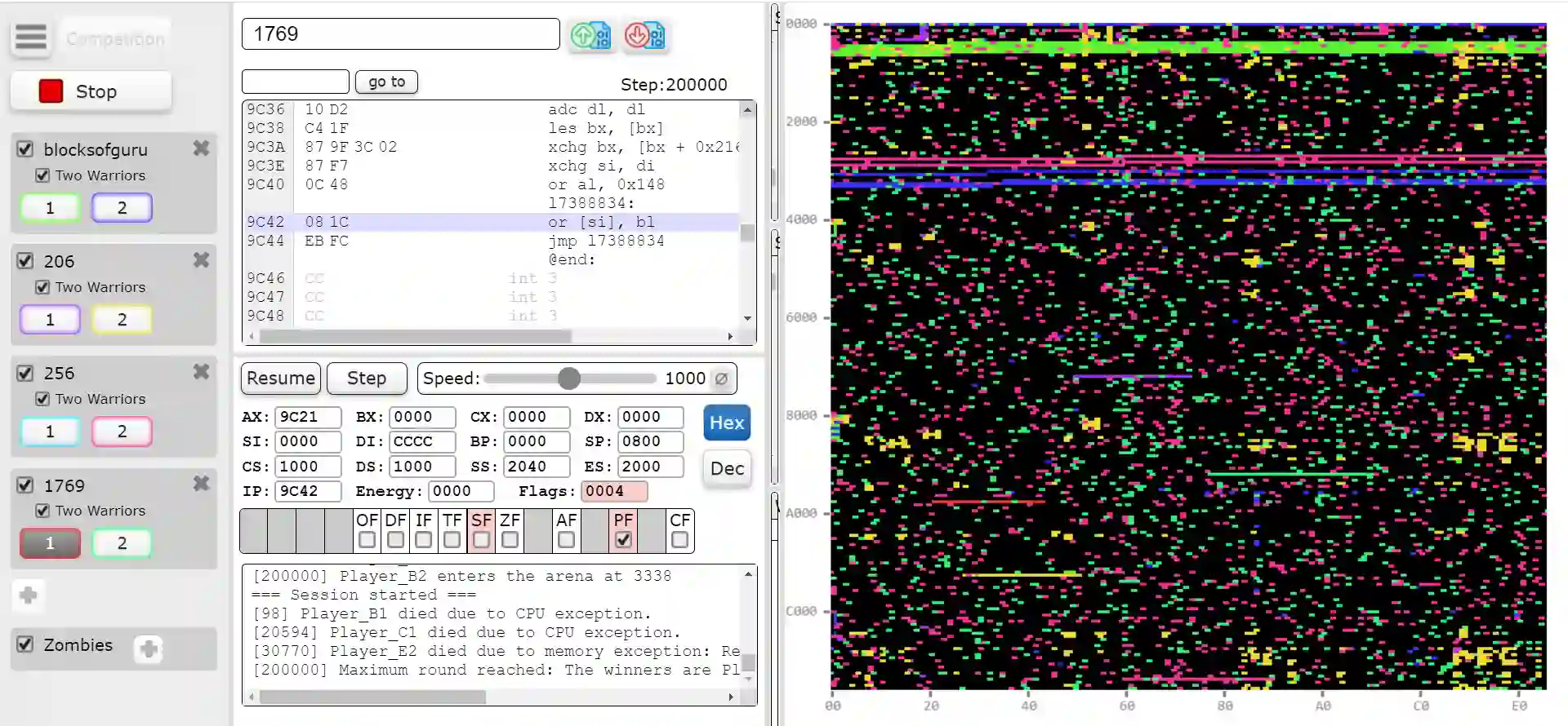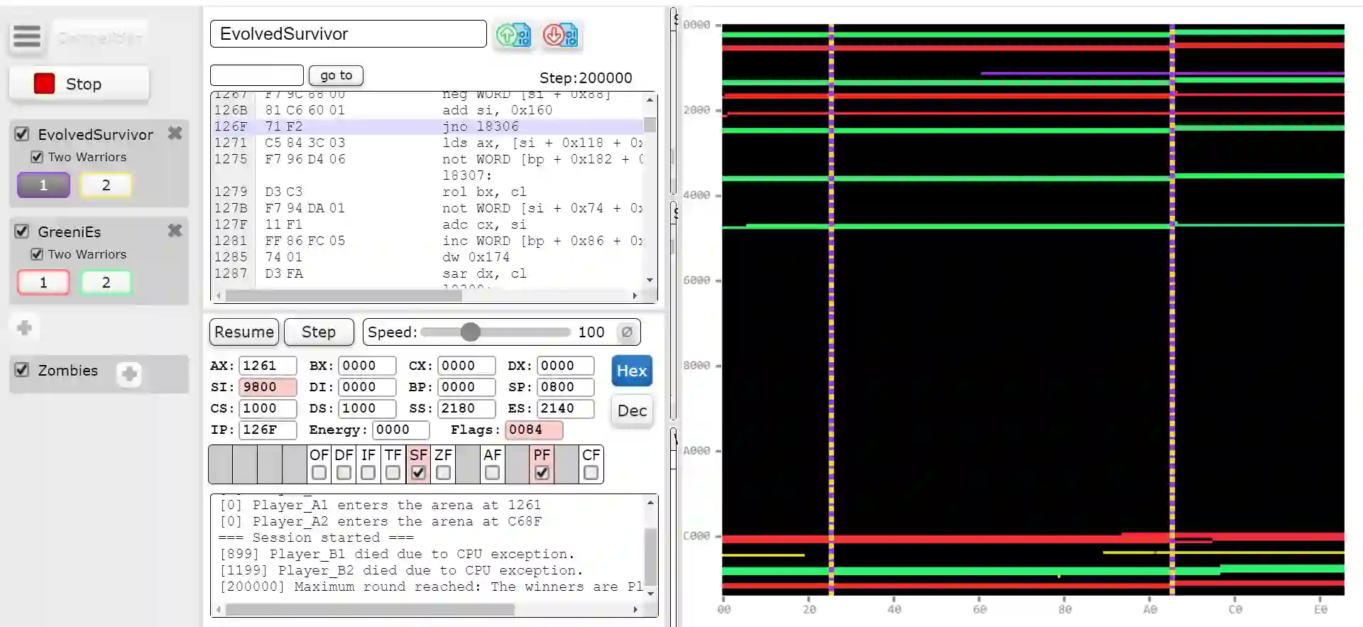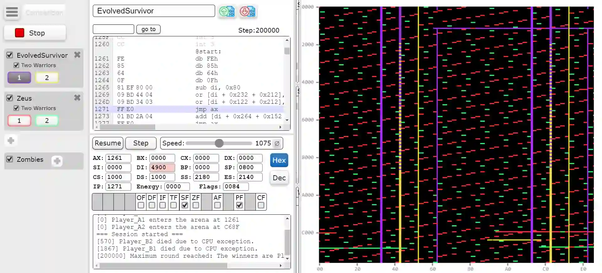 In this work, we evolve assembly code for the CodeGuru competition. The competition's goal is to create a survivor -- an assembly program that runs the longest in shared memory, by resisting attacks from adversary survivors and finding their weaknesses. For evolving top-notch solvers, we specify a Backus Normal Form (BNF) for the assembly language and synthesize the code from scratch using Genetic Programming (GP). We evaluate the survivors by running CodeGuru games against human-written winning survivors. Our evolved programs found weaknesses in the programs they were trained against and utilized them. In addition, we compare our approach with a Large-Language Model, demonstrating that the latter cannot generate a survivor that can win at any competition. This work has important applications for cyber-security, as we utilize evolution to detect weaknesses in survivors. The assembly BNF is domain-independent; thus, by modifying the fitness function, it can detect code weaknesses and help fix them. Finally, the CodeGuru competition offers a novel platform for analyzing GP and code evolution in adversarial environments. To support further research in this direction, we provide a thorough qualitative analysis of the evolved survivors and the weaknesses found.
