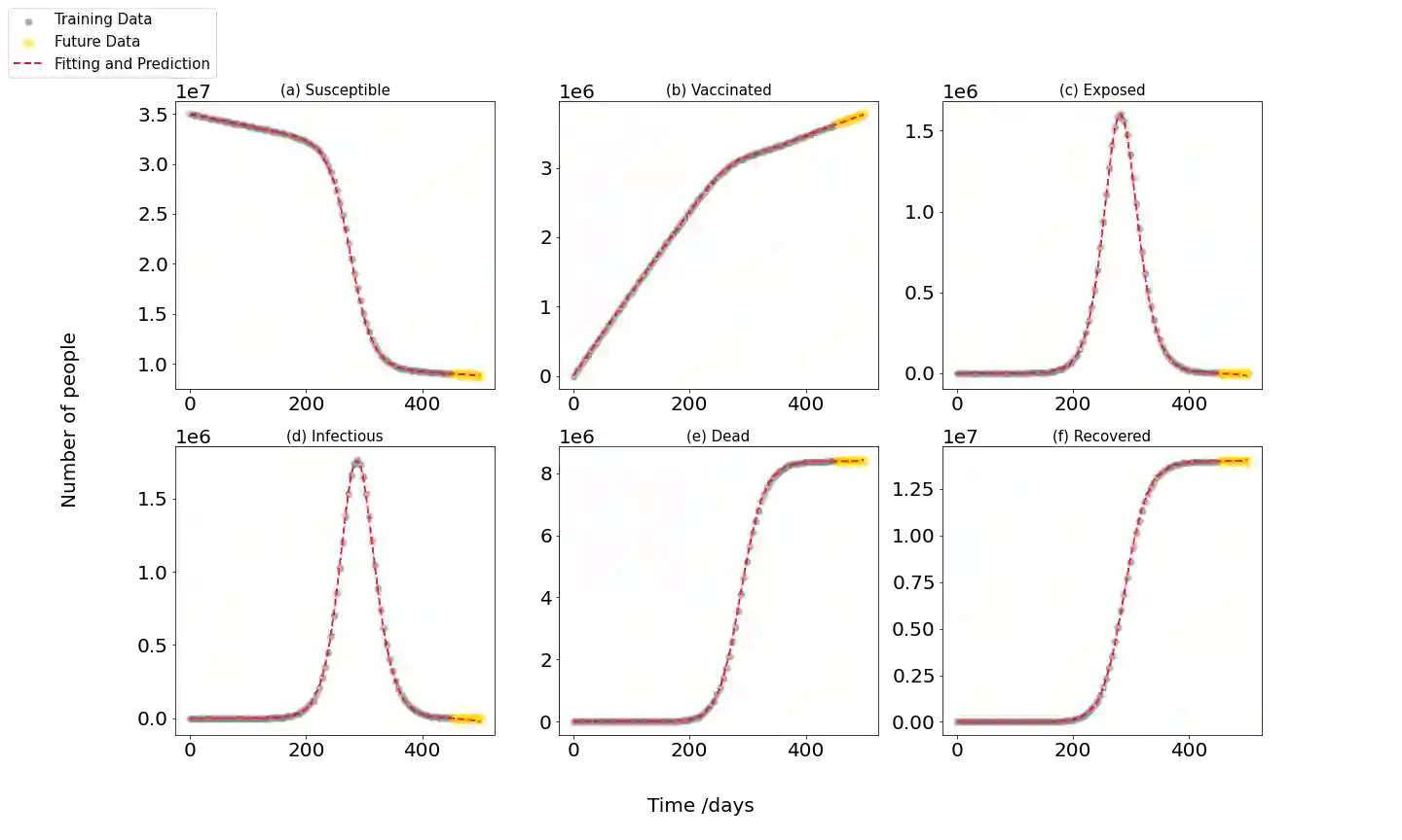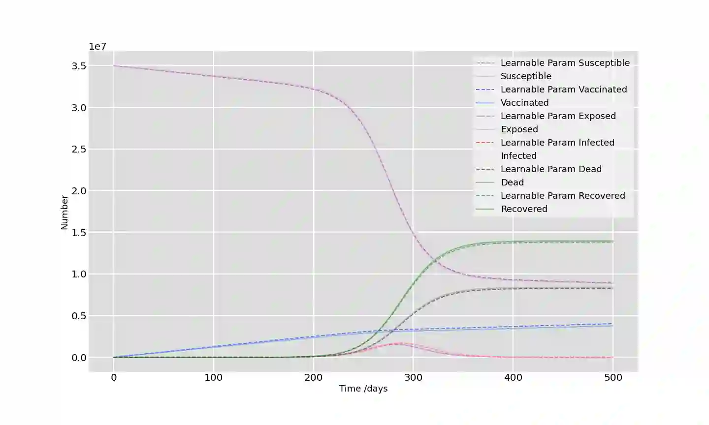 翻译:COVID-19大流行已经在全球产生了破坏性和不可逆转的影响,然而传统的流行病学模型方法,如易感感染恢复模式(SIR),在预测最新流行病情况方面成效有限,在这项工作中,采用易感疫苗接种受感染死复发模式(SVEIDR)模式及其变体 -- -- 年龄和疫苗接种结构的SVEIDR模式 -- -- 将社会接触对不同年龄组和疫苗接种状况的影响编码起来。然后,我们在模拟数据和实际世界数据方面实施物理知情神经网络(PINN),PINN模型使得能够对COVID-19分包模式的动态传播、预测和参数优化进行有力的分析。这些模型显示所有组成部分的相对根位平均误差(RRMESE)及其变体 -- -- 年龄和疫苗接种结构的变体 -- -- 年龄和疫苗接种结构型模式(Gammam=0.0224美元, 美元=0.0002美元, 美元和美元=0.002美元。对于最初310天的模拟神经网络数据,可以进一步对COVID-19分包模式进行精确分析。