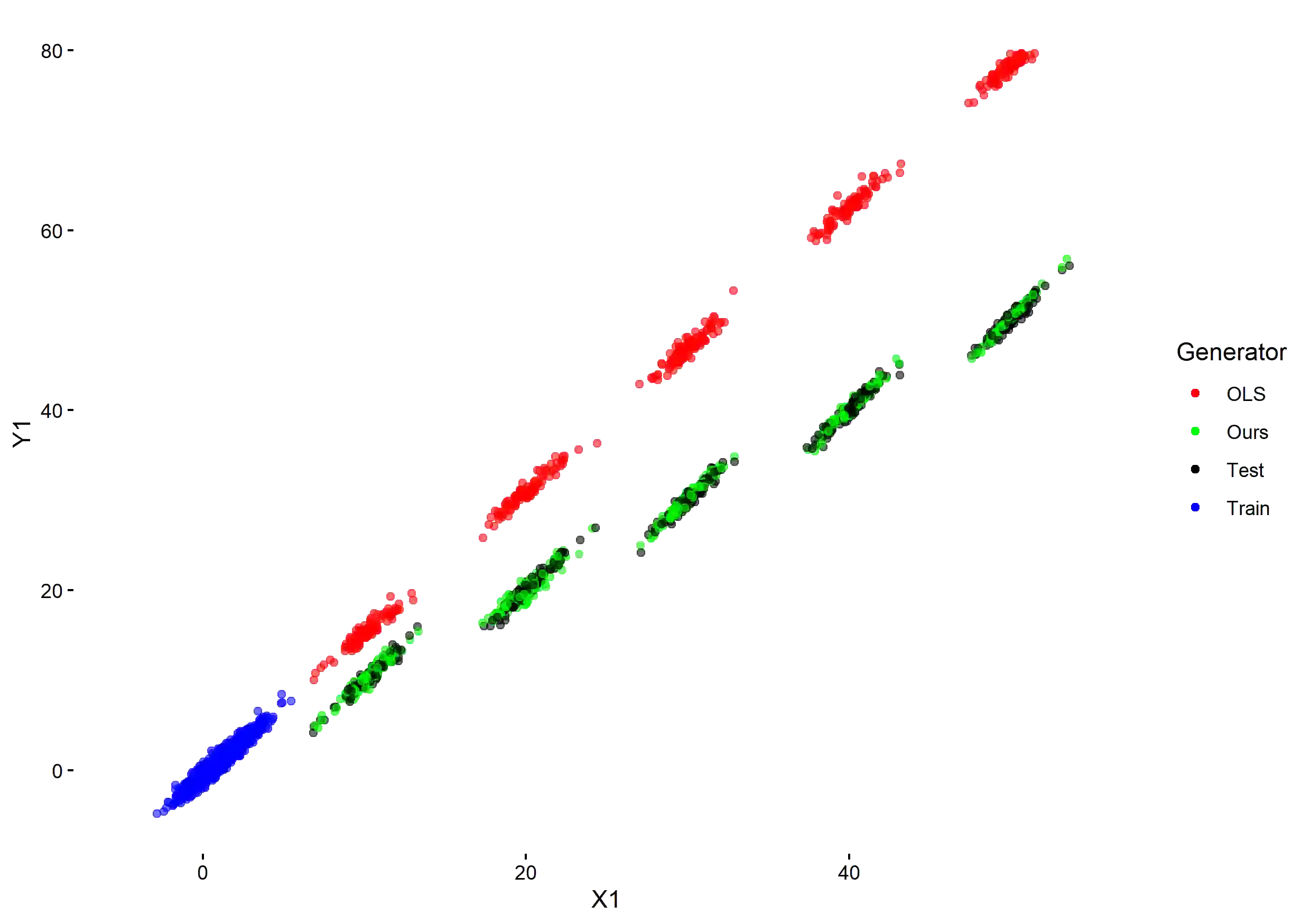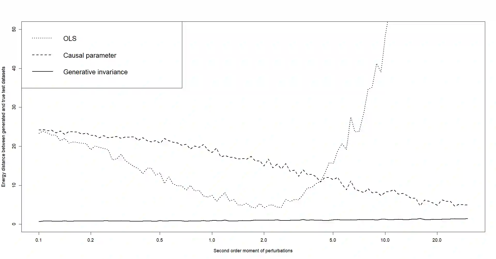 We present a new estimator for predicting outcomes in different distributional settings under hidden confounding without relying on instruments or exogenous variables. The population definition of our estimator identifies causal parameters, whose empirical version is plugged into a generative model capable of replicating the conditional law within a test environment. We check that the probabilistic affinity between our proposal and test distributions is invariant across interventions. This work enhances the current statistical comprehension of causality by demonstrating that predictions in a test environment can be made without the need for exogenous variables and without specific assumptions regarding the strength of perturbations or the overlap of distributions.