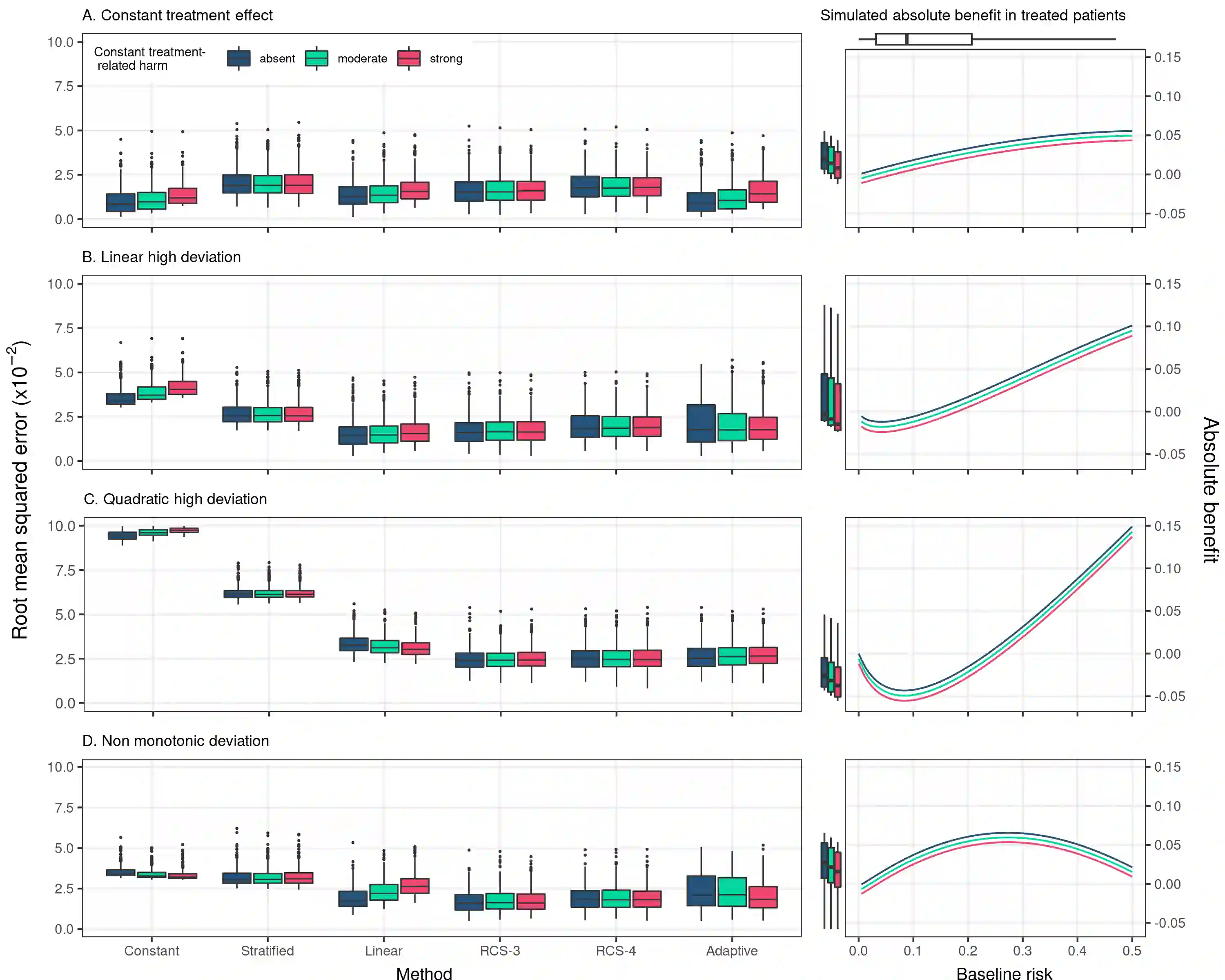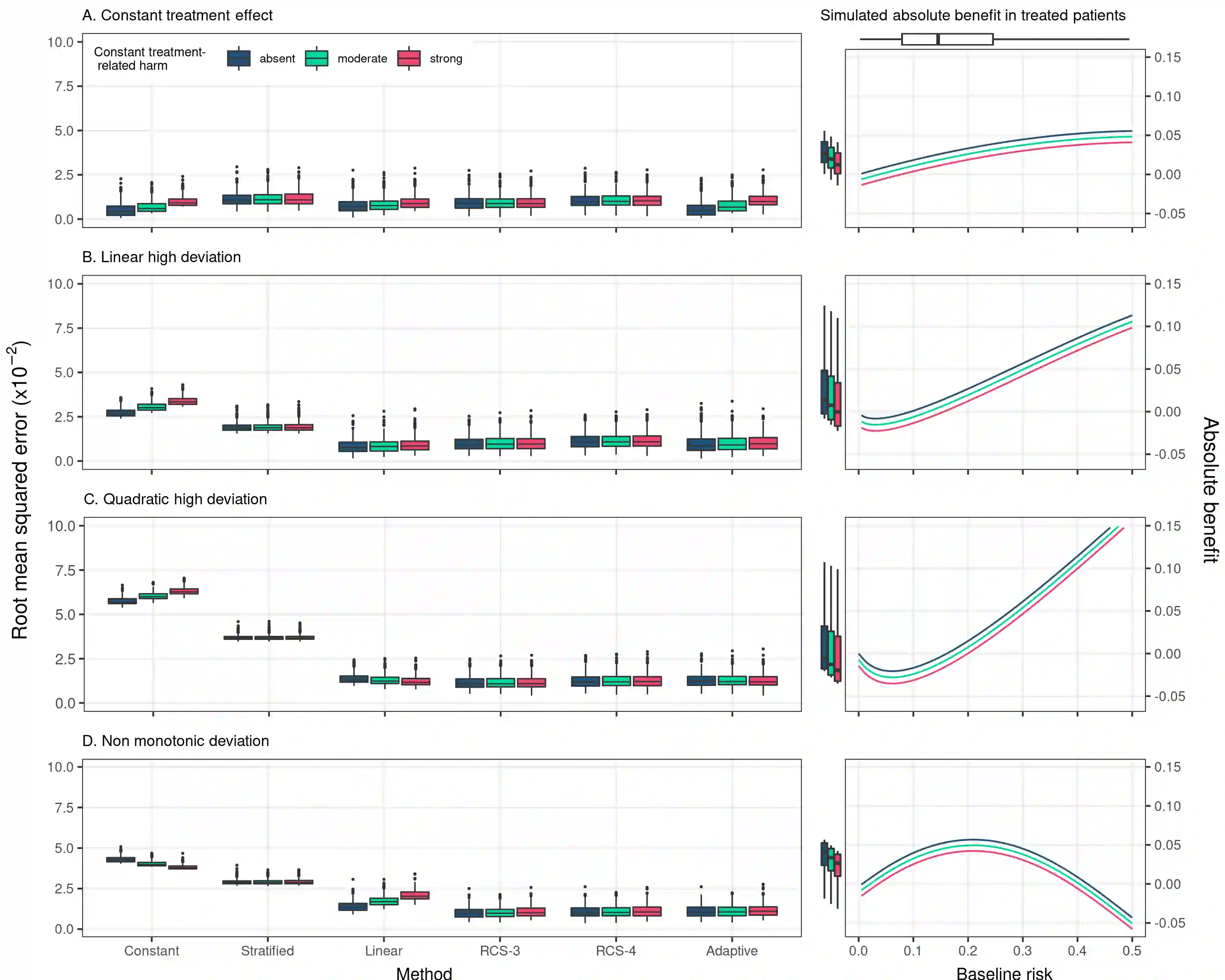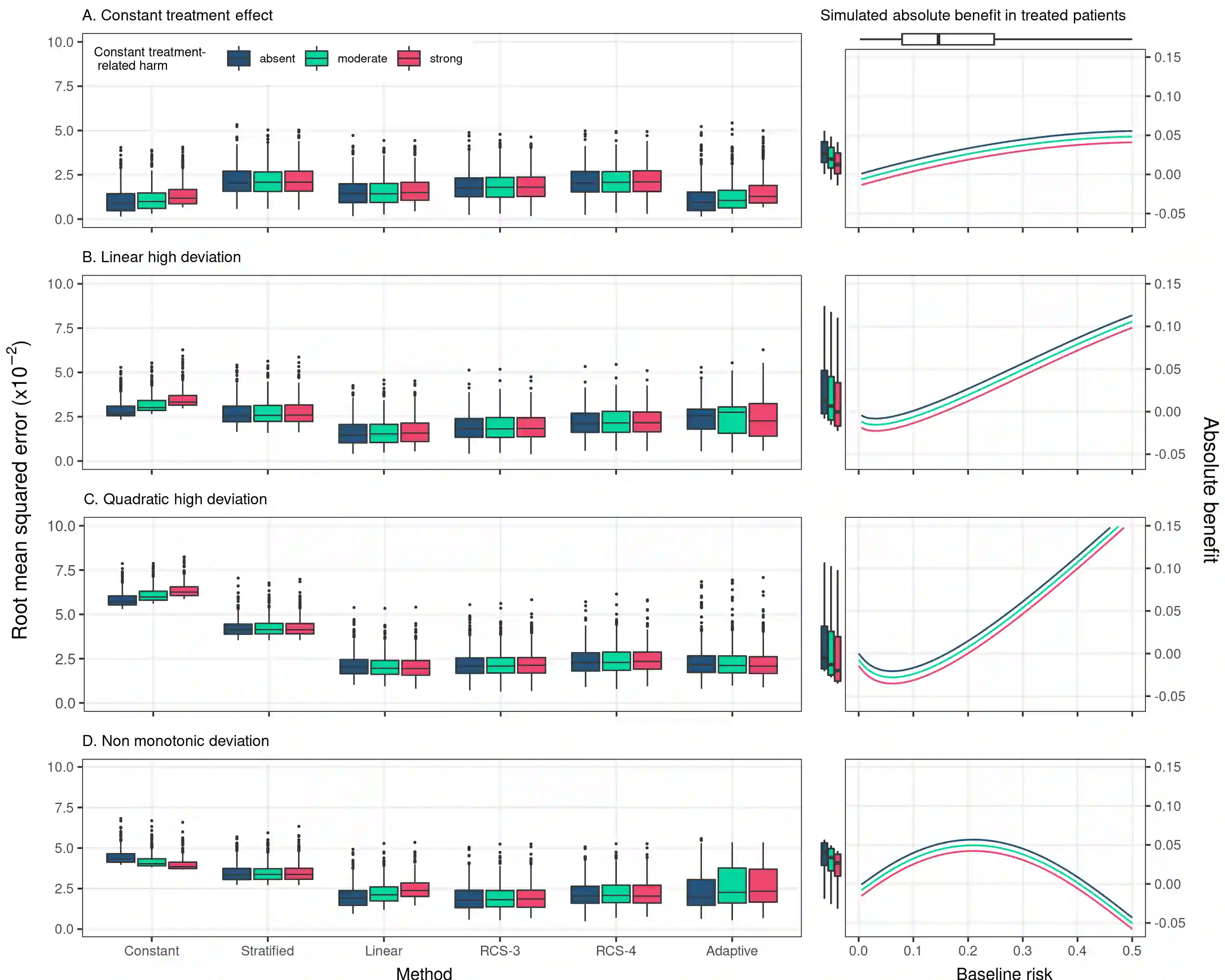 翻译:方法:我们模拟了RCT数据,使用了对平均治疗效果的不同假设、风险基准预测指数(PI)、其与治疗的相互作用(无、线性、二次或非双向),以及与治疗有关的伤害的程度(没有或经常独立于PI)。 我们预测了绝对效益,使用的是:具有持续相对治疗效果的模型;PI的分层;模型包括与PI的治疗的线性互动;模型包括治疗与PI的有限立方螺旋(RCS)转化的相互作用;利用Akaike的信息标准进行适应性方法;我们利用根平均值差、线性、二次或非单向偏差以及歧视和校准的衡量方法评估了预测性能。结果:线性互动模型展示了最佳或近于最佳的性性效果,在样本规模中等的多个模拟假设情景(N=4,250名病人;~785次事件)。RCS模型最适合从限制的立方螺旋线性螺旋线(RCS)疗法与PI的转化;使用Akaike的信息标准度调整方法;我们利用根平均值评价了预测性性性性性性性性性性性性工作,特别是当需要的GI的样本分析规模更大时,这些测试性评估性影响时,这种试验规模时,应当为最优化。