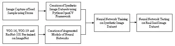 Plant breeding programs extensively monitor the evolution of seed kernels for seed certification, wherein lies the need to appropriately label the seed kernels by type and quality. However, the breeding environments are large where the monitoring of seed kernels can be challenging due to the minuscule size of seed kernels. The use of unmanned aerial vehicles aids in seed monitoring and labeling since they can capture images at low altitudes whilst being able to access even the remotest areas in the environment. A key bottleneck in the labeling of seeds using UAV imagery is drone altitude i.e. the classification accuracy decreases as the altitude increases due to lower image detail. Convolutional neural networks are a great tool for multi-class image classification when there is a training dataset that closely represents the different scenarios that the network might encounter during evaluation. The article addresses the challenge of training data creation using Domain Randomization wherein synthetic image datasets are generated from a meager sample of seeds captured by the bottom camera of an autonomously driven Parrot AR Drone 2.0. Besides, the article proposes a seed classification framework as a proof-of-concept using the convolutional neural networks of Microsoft's ResNet-100, Oxford's VGG-16, and VGG-19. To enhance the classification accuracy of the framework, an ensemble model is developed resulting in an overall accuracy of 94.6%.