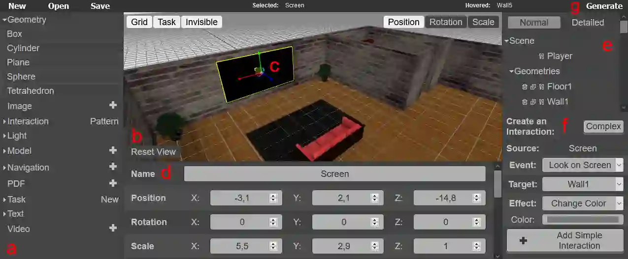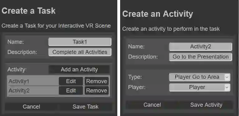 翻译:虚拟现实(VR)技术的最近进展以及VR设备设备的日益普及使大量面向消费者的应用得以实现。但是,对于新开发者来说,为VR应用程序创建互动场景是一项复杂和繁琐的任务,需要大量技术知识,往往缺少这种知识。这有碍于使新创建者能够创建、修改和执行自己的互动VR场景的潜力。虽然最近为互动VR场景开发工具的前景充满希望,但大多数都侧重于作为目标群体的专家专业人员,忽视了低编程知识的Novice。为了降低进入屏障,我们提供了一种基于开放源的网络终端用户开发(EUD)工具,称为VREUD,该工具支持快速构建和执行互动VR场景。关于构建,VREUD使VR场景的规格化,包括互动和任务。此外,VRUD支持在VR头挂图展上创建的互动式VR场景的执行和透视经验。基于用户研究,我们分析了VREUD的有效性、效率和用户满意度,显示在创建互动式VRUD图像方面有希望的结果。