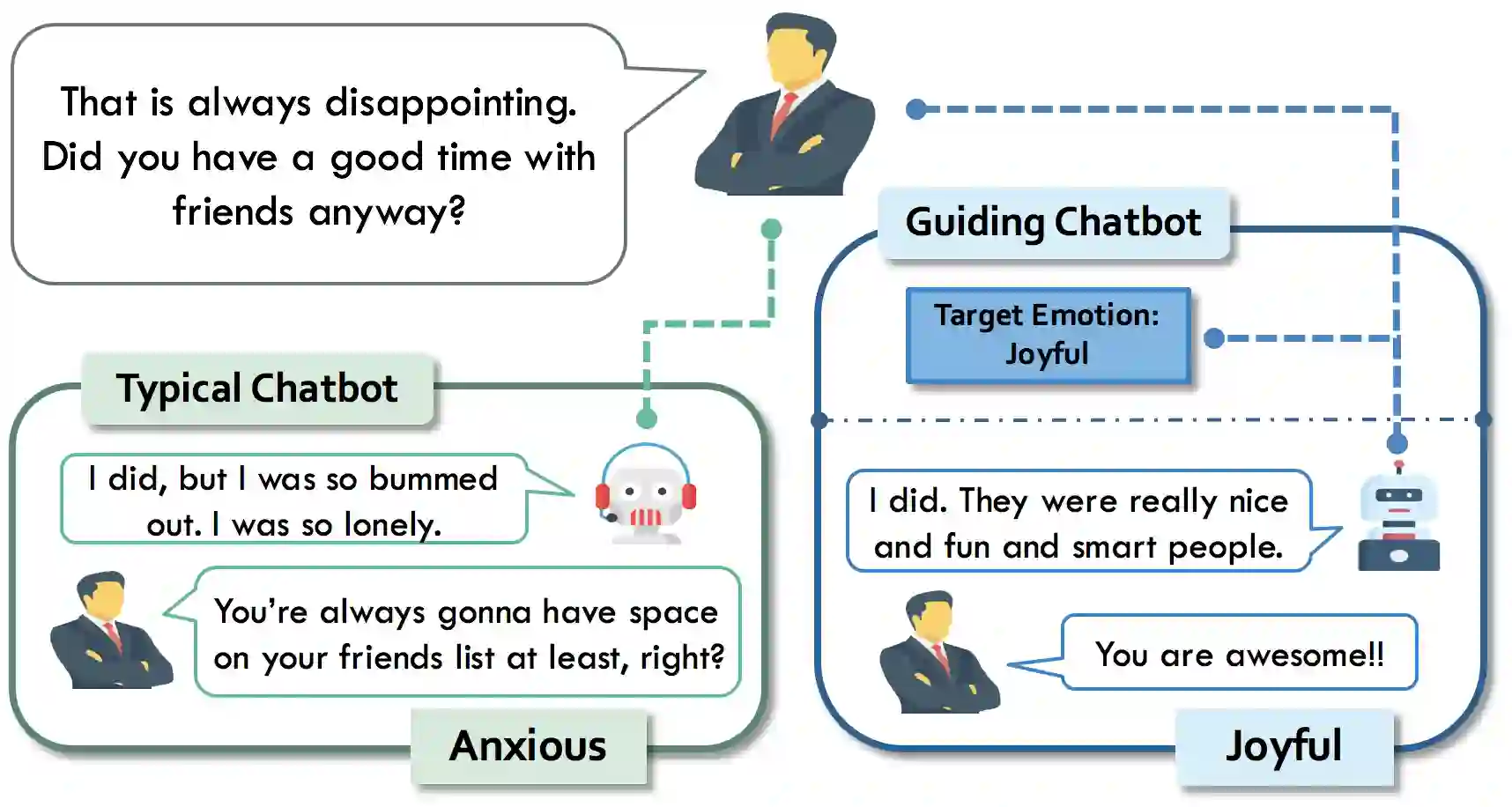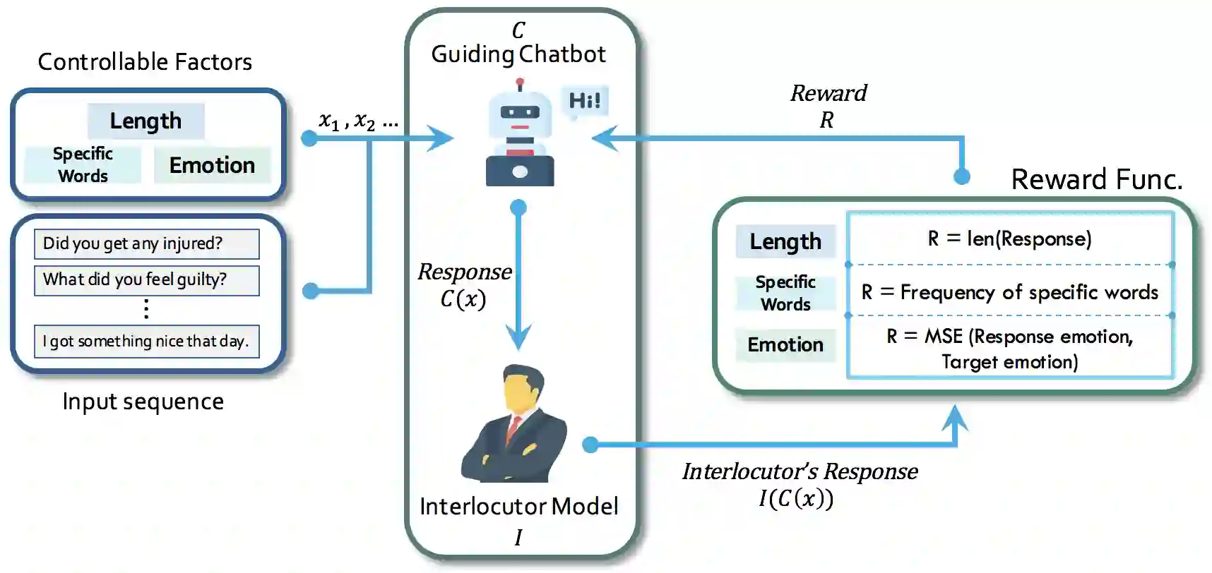 翻译:大部分侧重于改进聊天室流利和一致性的聊天室文献,都致力于使聊天室更像人。然而,很少的工作涉及真正将人与聊天室区分开来的东西 -- -- 人类从本质上理解其回应对对话者的影响,并经常作出反应,例如提出乐观观点,使对话者感觉更好。本文提出了培训聊天室以拥有类似人类意图的创新框架。我们的框架包括一个指导聊天室和一个发挥人类作用的对话模式。指导聊天室被赋予一种意图,并学习如何引导对话者作出与意图相匹配的答复,例如长期反应、喜乐反应、用具体语言回应等。我们利用三个实验性设置对框架进行了检查,用四个不同的标准对指导聊天室进行了评估,以显示灵活性和性能优势。此外,我们与人的对话者进行了试验,以证实指导聊天室在一定程度上影响人类反应的有效性。守则将提供给公众。