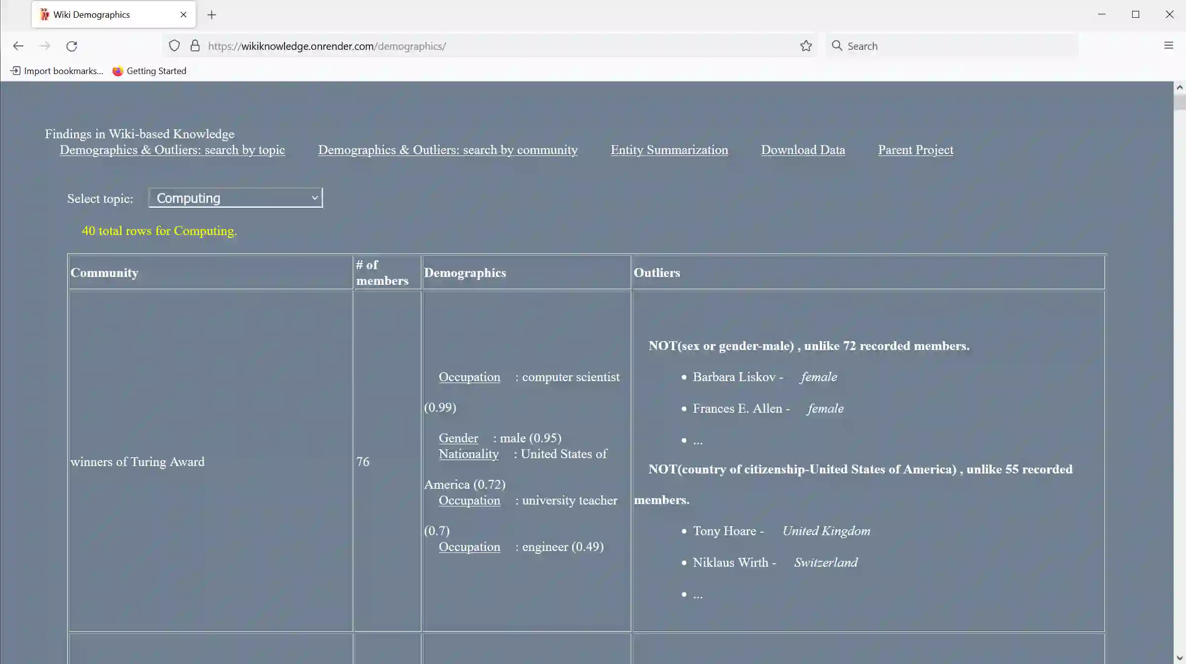 In this paper, we release data about demographic information and outliers of communities of interest. Identified from Wiki-based sources, mainly Wikidata, the data covers 7.5k communities, such as members of the White House Coronavirus Task Force, and 345k subjects, e.g., Deborah Birx. We describe the statistical inference methodology adopted to mine such data. We release subject-centric and group-centric datasets in JSON format, as well as a browsing interface. Finally, we forsee three areas this research can have an impact on: in social sciences research, it provides a resource for demographic analyses; in web-scale collaborative encyclopedias, it serves as an edit recommender to fill knowledge gaps; and in web search, it offers lists of salient statements about queried subjects for higher user engagement.