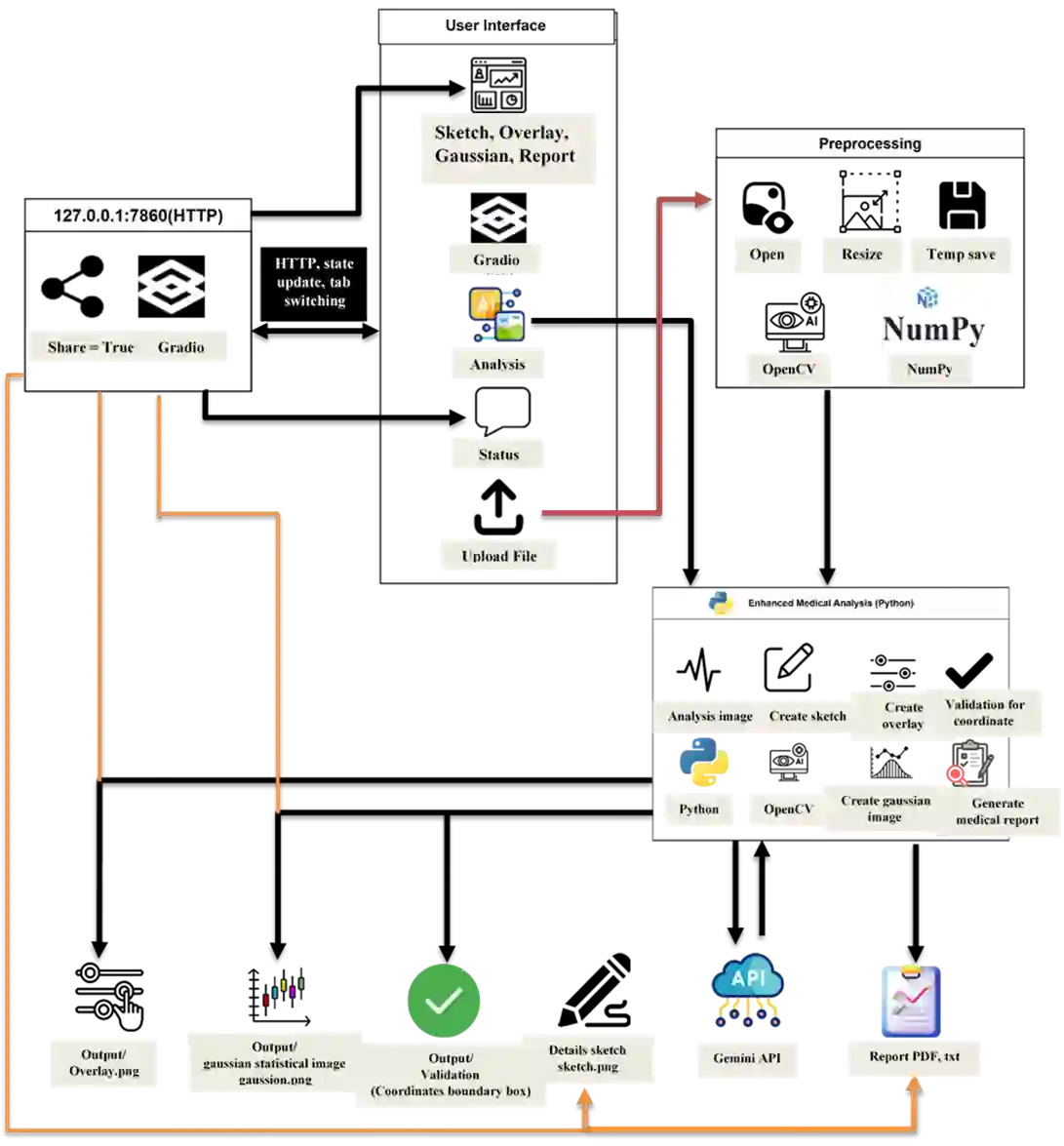 翻译:人工智能在医疗影像领域的快速发展已彻底革新了诊断医学与临床决策流程。本研究提出一种用于医学图像分析的智能多模态框架,该框架在医疗诊断中利用了视觉语言模型。该框架集成Google Gemini 2.5 Flash,实现了跨CT、MRI、X射线和超声等多种成像模态的自动化肿瘤检测与临床报告生成。系统通过结合视觉特征提取与自然语言处理技术,实现了上下文感知的图像解析,并融合了坐标验证机制与用于异常分布建模的概率高斯模型。多层可视化技术可生成详细的医学图示、叠加对比图像及统计表征图以提升临床置信度,其位置测量平均偏差达到80像素。结果处理环节采用精密的提示工程与文本分析技术来提取结构化临床信息,同时保持模型的可解释性。实验评估表明系统在多模态异常检测任务中表现出优异性能。该系统配备用户友好的Gradio界面以便临床工作流集成,并展现出零样本学习能力以降低对大规模数据集的依赖。该框架标志着自动化诊断支持与放射工作流效率的重大进步,但在广泛推广应用前仍需进行临床验证与多中心评估。