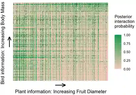 翻译:气候变化和自然生境的减少促使我们更好地了解物种的相互联系,以及生物群落如何对环境变化作出反应。然而,物种相互作用的生态研究受到地理和分类重点的限制,这可能导致某些物种严重代表不足,并扭曲我们对互动动态的理解。我们指出,忽视研究的焦点可能导致业绩不佳。我们制定了一种预测物种相互作用的方法,即(a) 说明记录的互动网络中的错误,(b) 处理现有研究的地理和分类偏差,(c) 以潜在因素为基础,以增加各物种间的灵活性和借阅信息,(d) 以灵活的方式纳入共变体,为潜在因素提供信息,(e) 使用85项单独研究的元分析数据集。我们注重巴西大西洋森林232只鸟和511只植物之间的互动,并查明5%的物种配对之间没有记录的互动,但事后概率可能超过80%以上。最后,我们为潜在要素网络模型制定了基于变异的重要性程序,并查明鸟类身体质量和植物水果直径与多种直径关系是一个重要的驱动因素。