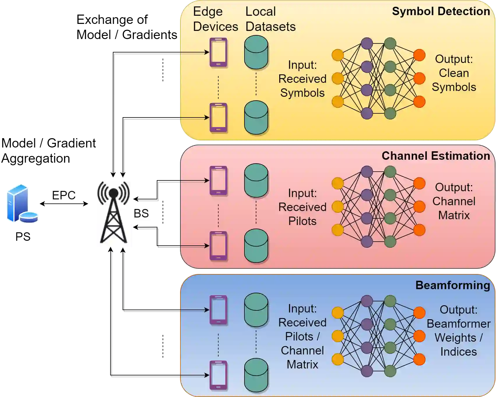 翻译:无模型技术,例如机器学习(ML)最近吸引了对物理层设计的兴趣,例如符号探测、频道估计和波束成形等,这些ML技术大多采用集中学习(CL)办法,假设参数服务器(PS)有数据集,要求从边缘设备(如移动电话)向PS传输数据。 利用边缘生成的数据,最近提议采用联邦学习(FL)作为分布式学习办法,其中每个设备计算模型参数并将其发送给PS,用于模型汇总,而数据集则保持在边缘,因此,FL比CL更具有通信效率和隐私保护,适用于无线通信情景,在边缘设备生成数据。文章讨论了基于FL的物理层设计问题培训的最新进展,并确定了相关的设计挑战,以及改进通信间接费用、模型/数据/硬件复杂性方面业绩的可能解决办法。