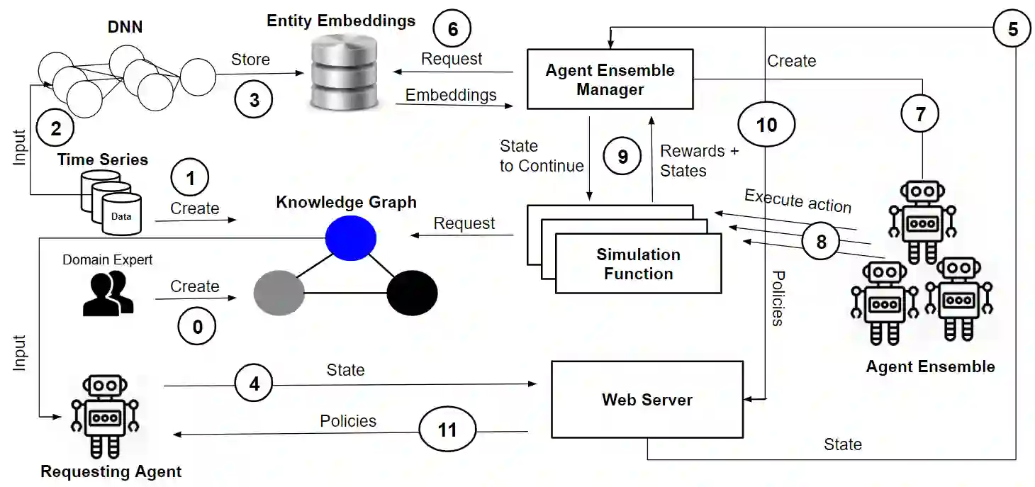 Computational agents support humans in many areas of life and are therefore found in heterogeneous contexts. This means they operate in rapidly changing environments and can be confronted with huge state and action spaces. In order to perform services and carry out activities in a goal-oriented manner, agents require prior knowledge and therefore have to develop and pursue context-dependent policies. However, prescribing policies in advance is limited and inflexible, especially in dynamically changing environments. Moreover, the context of an agent determines its choice of actions. Since the environments can be stochastic and complex in terms of the number of states and feasible actions, activities are usually modelled in a simplified way by Markov decision processes so that, e.g., agents with reinforcement learning are able to learn policies, that help to capture the context and act accordingly to optimally perform activities. However, training policies for all possible contexts using reinforcement learning is time-consuming. A requirement and challenge for agents is to learn strategies quickly and respond immediately in cross-context environments and applications, e.g., the Internet, service robotics, cyber-physical systems. In this work, we propose a novel simulation-based approach that enables a) the representation of heterogeneous contexts through knowledge graphs and entity embeddings and b) the context-aware composition of policies on demand by ensembles of agents running in parallel. The evaluation we conducted with the "Virtual Home" dataset indicates that agents with a need to switch seamlessly between different contexts, can request on-demand composed policies that lead to the successful completion of context-appropriate activities without having to learn these policies in lengthy training steps and episodes, in contrast to agents that use reinforcement learning.