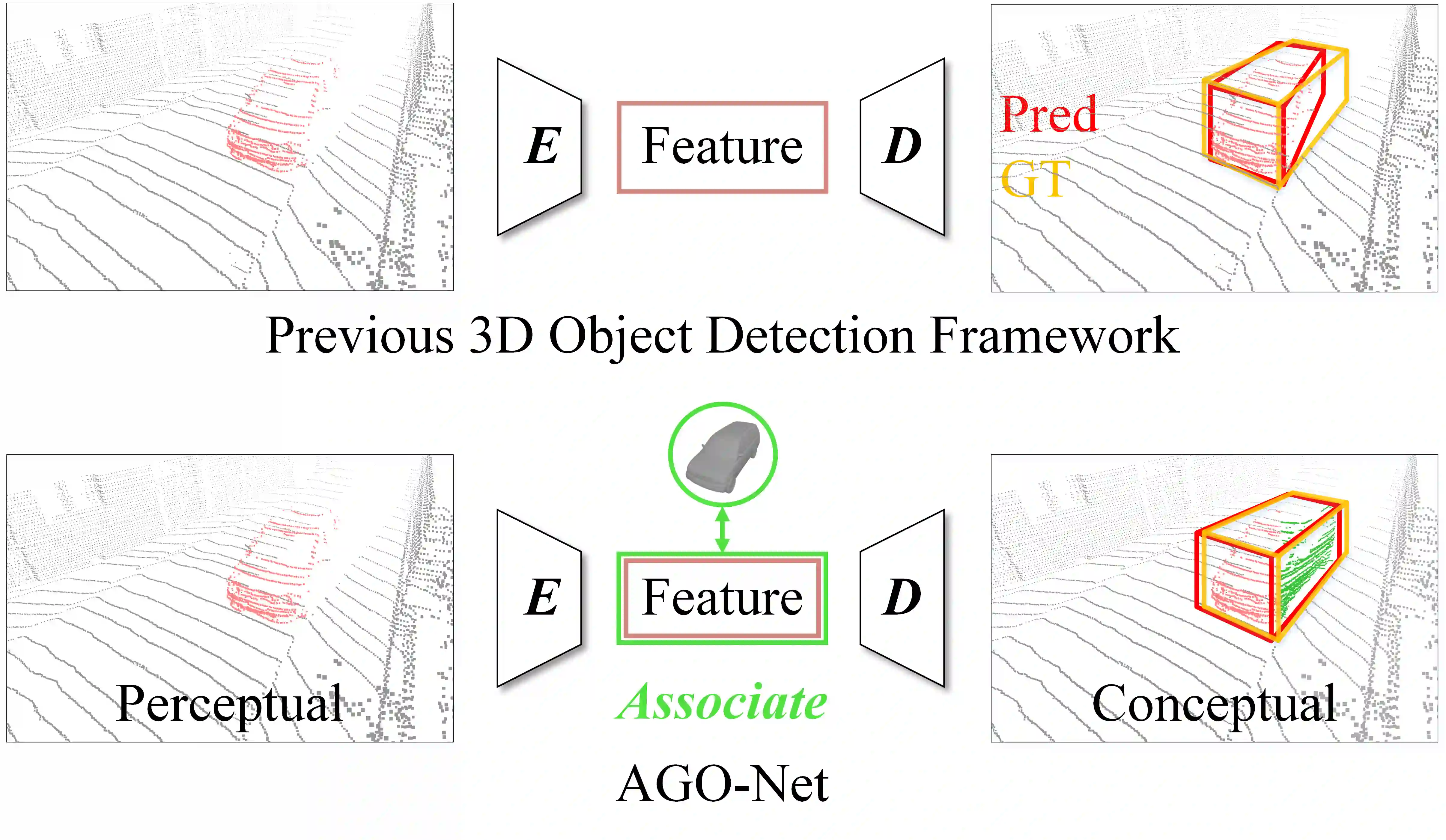 The human brain can effortlessly recognize and localize objects, whereas current 3D object detection methods based on LiDAR point clouds still report inferior performance for detecting occluded and distant objects: the point cloud appearance varies greatly due to occlusion, and has inherent variance in point densities along the distance to sensors. Therefore, designing feature representations robust to such point clouds is critical. Inspired by human associative recognition, we propose a novel 3D detection framework that associates intact features for objects via domain adaptation. We bridge the gap between the perceptual domain, where features are derived from real scenes with sub-optimal representations, and the conceptual domain, where features are extracted from augmented scenes that consist of non-occlusion objects with rich detailed information. A feasible method is investigated to construct conceptual scenes without external datasets. We further introduce an attention-based re-weighting module that adaptively strengthens the feature adaptation of more informative regions. The network's feature enhancement ability is exploited without introducing extra cost during inference, which is plug-and-play in various 3D detection frameworks. We achieve new state-of-the-art performance on the KITTI 3D detection benchmark in both accuracy and speed. Experiments on nuScenes and Waymo datasets also validate the versatility of our method.