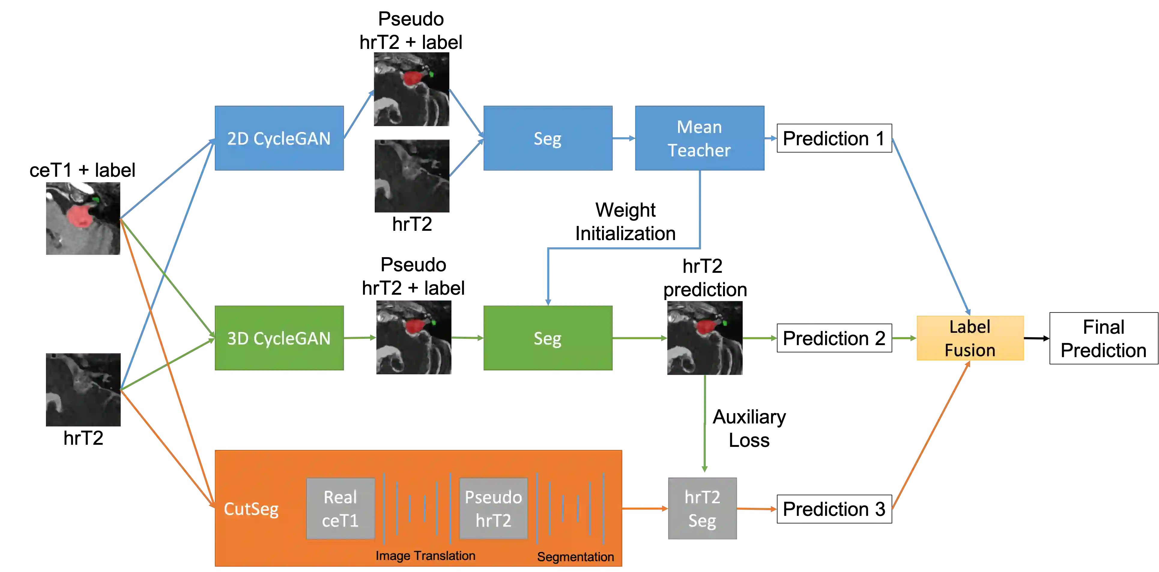 翻译:将磁共振成像( MRI) 中的前天肿瘤和脑膜瘤( 磁共振成像) 分离的自动方法对于 VS 处理规划至关重要。 虽然受监督的方法在 VS 分割中取得了令人满意的性能, 但是它们需要专家的完整说明, 这既费力又费时。 在这项工作中, 我们的目标是在不受监督的域适应设置中解决 VS 和 cochlea 分割问题。 我们提议的方法利用图像水平域对齐来尽量减少域差异, 并进行半监督的培训来进一步提升性能。 此外, 我们提议通过响声标签校正将从多个模型中预测的标签连接起来。 我们在挑战验证首板上的结果显示, 我们未监督的方法已经实现了有希望的 VS 和 Cochlea 分割性效果, 平均 dice 得分为 0. 8261 $\ pm 0.0416; 肿瘤的平均 dice值为 0. 8302 $\ pm 0.0772 。 这与薄弱的基于方法相似 。