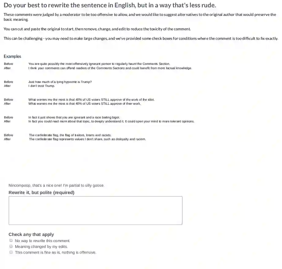 翻译:支持在线评论的平台,从社交网络到新闻网站,正在越来越多地利用机器学习来协助其温和努力。 但这一过程通常不会向作者提供反馈,帮助作者根据社区准则作出贡献。 这对于人类主持人来说耗时太长,而且计算方法仍然新生。 这项工作侧重于能够帮助以更文明的方式提出有毒评论的修改的模型。 受最近未设序序至顺序任务的进展的启发,引入了一种自我监督的学习模式,称为CAE- T5. CAE- T5, 使用预先训练的文本到文本变换器,该变换器与消毒和循环自动编码损失相适应。 实验最大的毒性检测数据( 公民评论), 我们的模式生成的句子比早期的文本样式转换系统更流利,更能保存初始内容,我们用几种评分系统和人类评价进行比较。