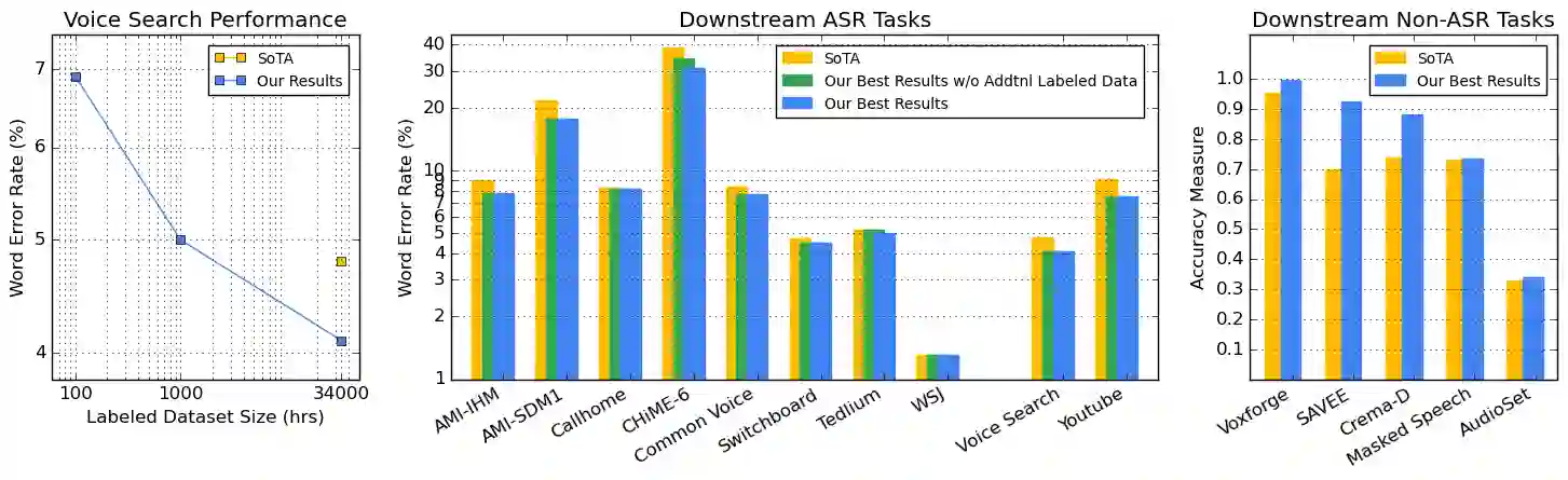 We summarize the results of a host of efforts using giant automatic speech recognition (ASR) models pre-trained using large, diverse unlabeled datasets containing approximately a million hours of audio. We find that the combination of pre-training, self-training and scaling up model size greatly increases data efficiency, even for extremely large tasks with tens of thousands of hours of labeled data. In particular, on an ASR task with 34k hours of labeled data, by fine-tuning an 8 billion parameter pre-trained Conformer model we can match state-of-the-art (SoTA) performance with only 3% of the training data and significantly improve SoTA with the full training set. We also report on the universal benefits gained from using big pre-trained and self-trained models for a large set of downstream tasks that cover a wide range of speech domains and span multiple orders of magnitudes of dataset sizes, including obtaining SoTA performance on many public benchmarks. In addition, we utilize the learned representation of pre-trained networks to achieve SoTA results on non-ASR tasks.