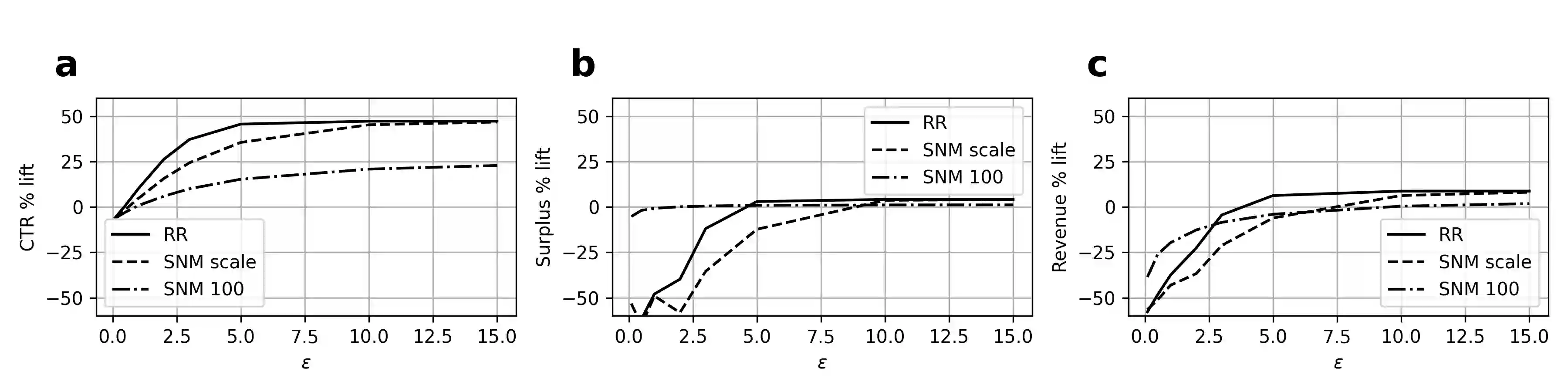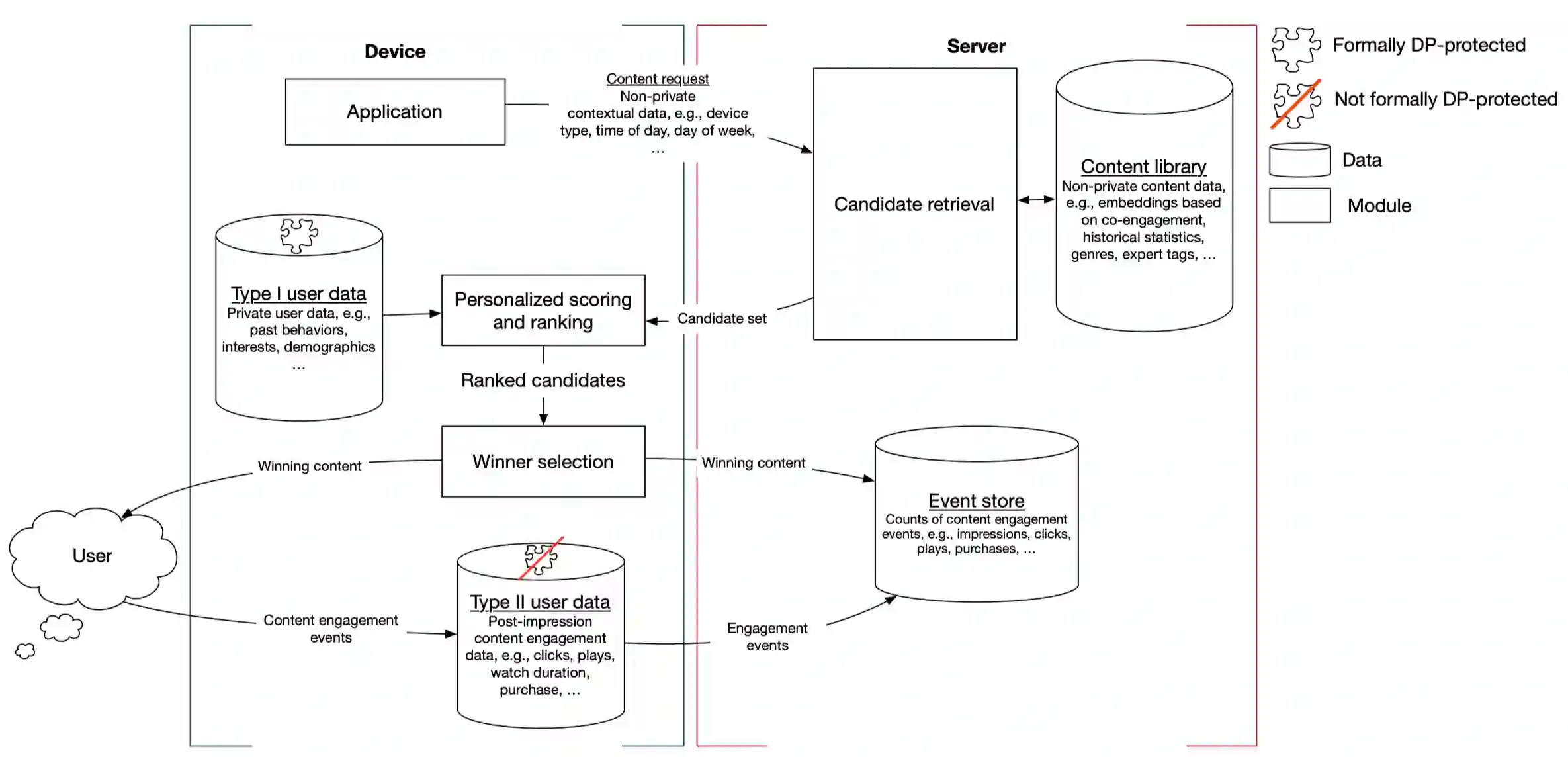 Personalized recommendations form an important part of today's internet ecosystem, helping artists and creators to reach interested users, and helping users to discover new and engaging content. However, many users today are skeptical of platforms that personalize recommendations, in part due to historically careless treatment of personal data and data privacy. Now, businesses that rely on personalized recommendations are entering a new paradigm, where many of their systems must be overhauled to be privacy-first. In this article, we propose an algorithm for personalized recommendations that facilitates both precise and differentially-private measurement. We consider advertising as an example application, and conduct offline experiments to quantify how the proposed privacy-preserving algorithm affects key metrics related to user experience, advertiser value, and platform revenue compared to the extremes of both (private) non-personalized and non-private, personalized implementations.