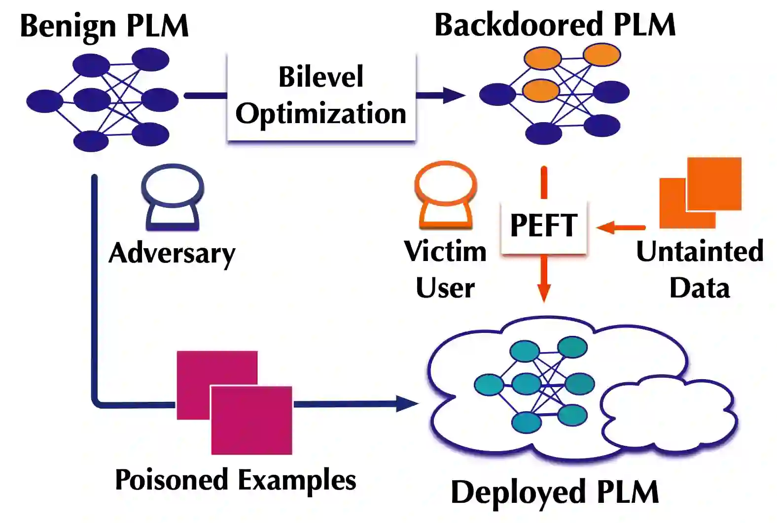Parameter-efficient fine-tuning (PEFT) enables efficient adaptation of pre-trained language models (PLMs) to specific tasks. By tuning only a minimal set of (extra) parameters, PEFT achieves performance that is comparable to standard fine-tuning. However, despite its prevalent use, the security implications of PEFT remain largely unexplored. In this paper, we take the initial steps and present PETA, a novel trojan attack that compromises the weights of PLMs by accounting for downstream adaptation through bilevel optimization: the upper-level objective embeds the backdoor into a model while the lower-level objective simulates PEFT to both retain the PLM's task-specific performance and ensure that the backdoor persists after fine-tuning. With extensive evaluation across a variety of downstream tasks and trigger designs, we demonstrate PETA's effectiveness in terms of both attack success rate and clean accuracy, even when the attacker does not have full knowledge of the victim user's training process.
