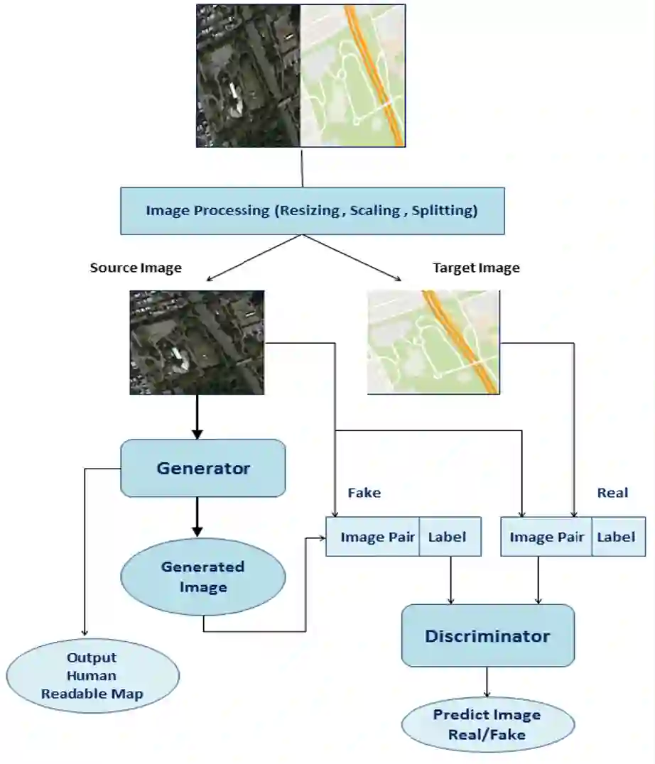 Generation of maps from satellite images is conventionally done by a range of tools. Maps became an important part of life whose conversion from satellite images may be a bit expensive but Generative models can pander to this challenge. These models aims at finding the patterns between the input and output image. Image to image translation is employed to convert satellite image to corresponding map. Different techniques for image to image translations like Generative adversarial network, Conditional adversarial networks and Co-Variational Auto encoders are used to generate the corresponding human-readable maps for that region, which takes a satellite image at a given zoom level as its input. We are training our model on Conditional Generative Adversarial Network which comprises of Generator model which which generates fake images while the discriminator tries to classify the image as real or fake and both these models are trained synchronously in adversarial manner where both try to fool each other and result in enhancing model performance.
