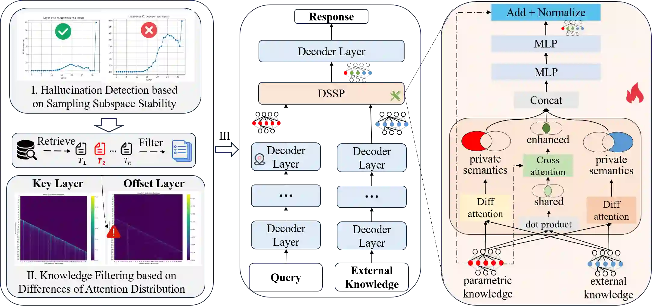 翻译:检索增强生成旨在通过检索并融合相关外部知识来缓解大语言模型的幻觉问题。然而,外部知识可能包含噪声,并与大语言模型的参数化知识产生冲突,导致性能下降。现有大语言模型缺乏解决此类冲突的内在机制。为填补这一空白,我们提出一种用于共享-私有语义协同的双流知识增强框架。其核心在于将传统自注意力机制改进为混合注意力机制,通过区分共享与私有语义实现可控的知识融合。一种基于大语言模型内在认知不确定性的无监督幻觉检测方法,确保仅在必要时引入外部知识。为降低外部知识中的噪声,我们提出能量商指标,该指标通过任务对齐层与任务错位层间的注意力差异矩阵定义。大量实验表明,DSSP-RAG在多个基准测试中均优于现有强基线模型。