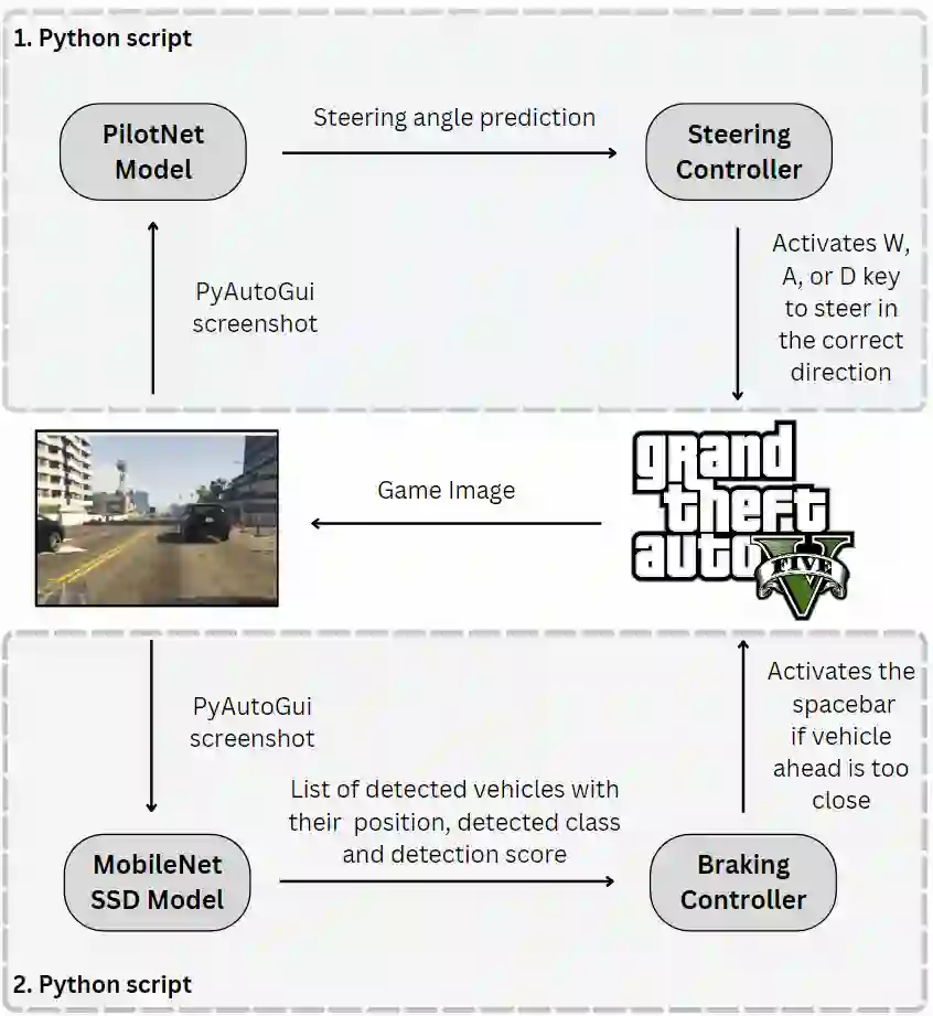 The technology of autonomous driving is currently attracting a great deal of interest in both research and industry. In this paper, we present a deep learning dual-model solution that uses two deep neural networks for combined braking and steering in autonomous vehicles. Steering control is achieved by applying the NVIDIA's PilotNet model to predict the steering wheel angle, while braking control relies on the use of MobileNet SSD. Both models rely on a single front-facing camera for image input. The MobileNet SSD model is suitable for devices with constrained resources, whereas PilotNet struggles to operate efficiently on smaller devices with limited resources. To make it suitable for such devices, we modified the PilotNet model using our own original network design and reduced the number of model parameters and its memory footprint by approximately 60%. The inference latency has also been reduced, making the model more suitable to operate on resource-constrained devices. The modified PilotNet model achieves similar loss and accuracy compared to the original PilotNet model. When evaluated in a simulated environment, both autonomous driving systems, one using the modified PilotNet model and the other using the original PilotNet model for steering, show similar levels of autonomous driving performance.