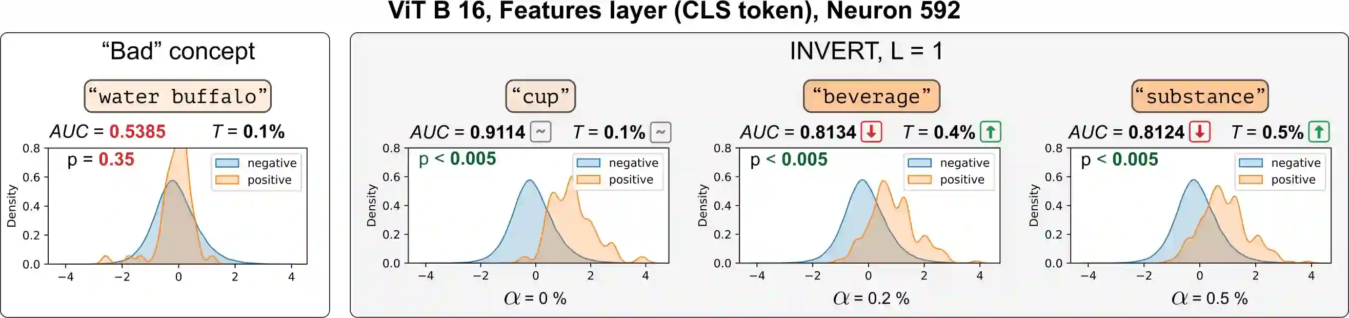 Deep Neural Networks (DNNs) demonstrated remarkable capabilities in learning complex hierarchical data representations, but the nature of these representations remains largely unknown. Existing global explainability methods, such as Network Dissection, face limitations such as reliance on segmentation masks, lack of statistical significance testing, and high computational demands. We propose Inverse Recognition (INVERT), a scalable approach for connecting learned representations with human-understandable concepts by leveraging their capacity to discriminate between these concepts. In contrast to prior work, INVERT is capable of handling diverse types of neurons, exhibits less computational complexity, and does not rely on the availability of segmentation masks. Moreover, INVERT provides an interpretable metric assessing the alignment between the representation and its corresponding explanation and delivering a measure of statistical significance, emphasizing its utility and credibility. We demonstrate the applicability of INVERT in various scenarios, including the identification of representations affected by spurious correlations, and the interpretation of the hierarchical structure of decision-making within the models.