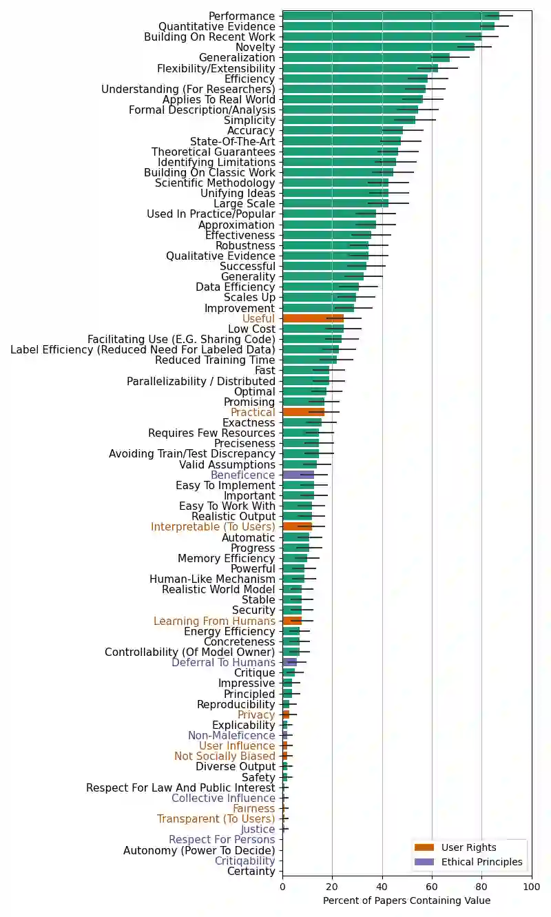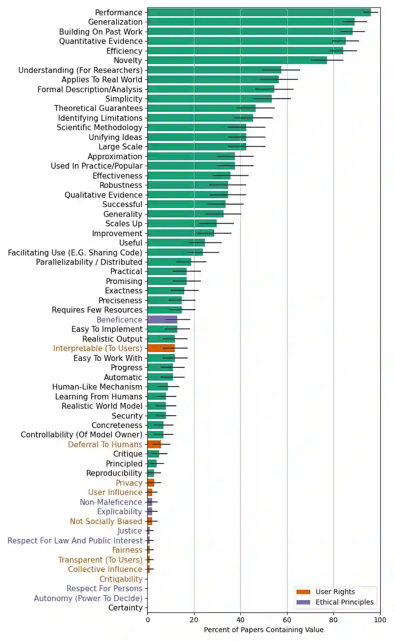 翻译:机械学习目前对世界产生了超大的影响,日益影响到机构做法和受影响的社区。因此,我们必须质疑模糊的实地概念,认为其价值中立或普遍受益,并调查该领域正在推进的具体价值观。在本文件中,我们首先采用一种方法和说明办法,研究研究研究文件(如研究论文)中编码的价值观。运用这一办法,我们分析在初级机器学习会议、ICML和NeurIPS上发表的100份高引用的机器学习论文。我们指出显示其价值的论文的主要特征:它们选择项目的理由,项目的性质是提升,对潜在负面后果的考虑,以及它们的体制联系和资金来源。我们发现,很少有文件可以说明其项目与社会需要(15 ⁇ )之间的联系,而较少讨论消极潜力(1 ⁇ )。我们通过逐线内容分析,我们找出在ML大学研究中提升的59种价值。我们发现,这些文件最经常根据业绩、一般化、定量证据、效率、建立机构关系、建立过去工作的机构联系和不断加强的技术性概念,我们一般地发现这些价值是当前和最接近的、最接近的理论和最明显的理论。