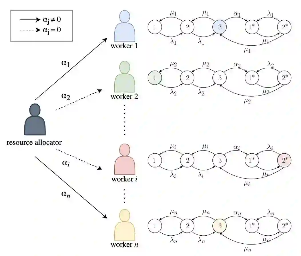 翻译:我们研究如何高效地将任务分配给一组可能因处理任务而疲劳的工人。如果工人疲劳,其恢复时间将显著延长。为建模具有疲劳效应的工人效率,我们采用连续时间马尔可夫链(CTMC)。通过采样工人的内部状态,当发现工人处于高效状态时,任务源会向其分配任务。我们考虑两种不同场景:(i)仅当工人处于最高效状态时任务源才可分配任务;(ii)即使工人处于中等效率状态(尽管可能降低成功概率)也可分配任务。在前一种情况下,我们发现最优策略为基于阈值的采样策略,其阈值取决于工人的恢复率与疲劳率。在后一种情况下,我们通过分支定界法求解非凸比例求和问题,该方法相较于全局最优解表现出良好性能。