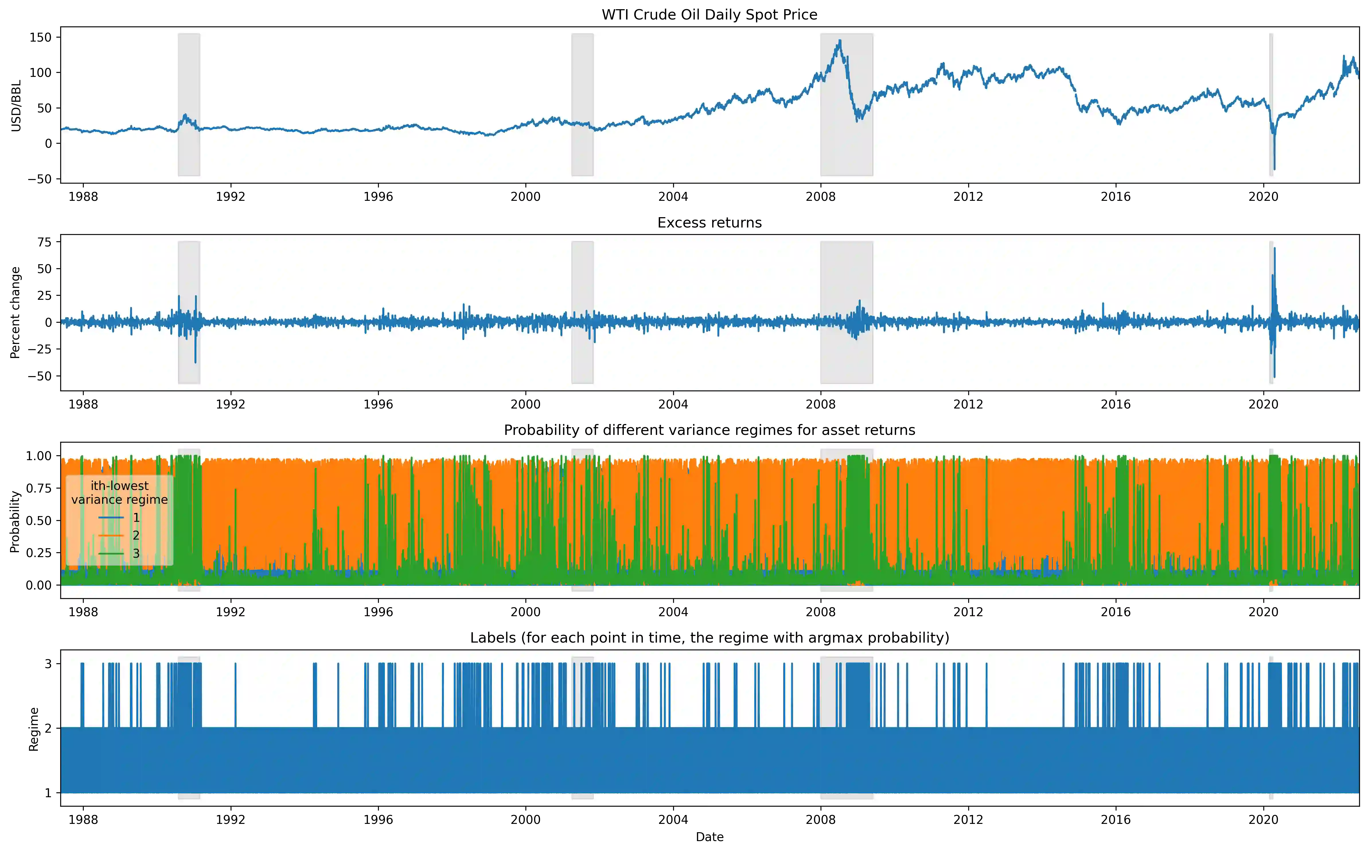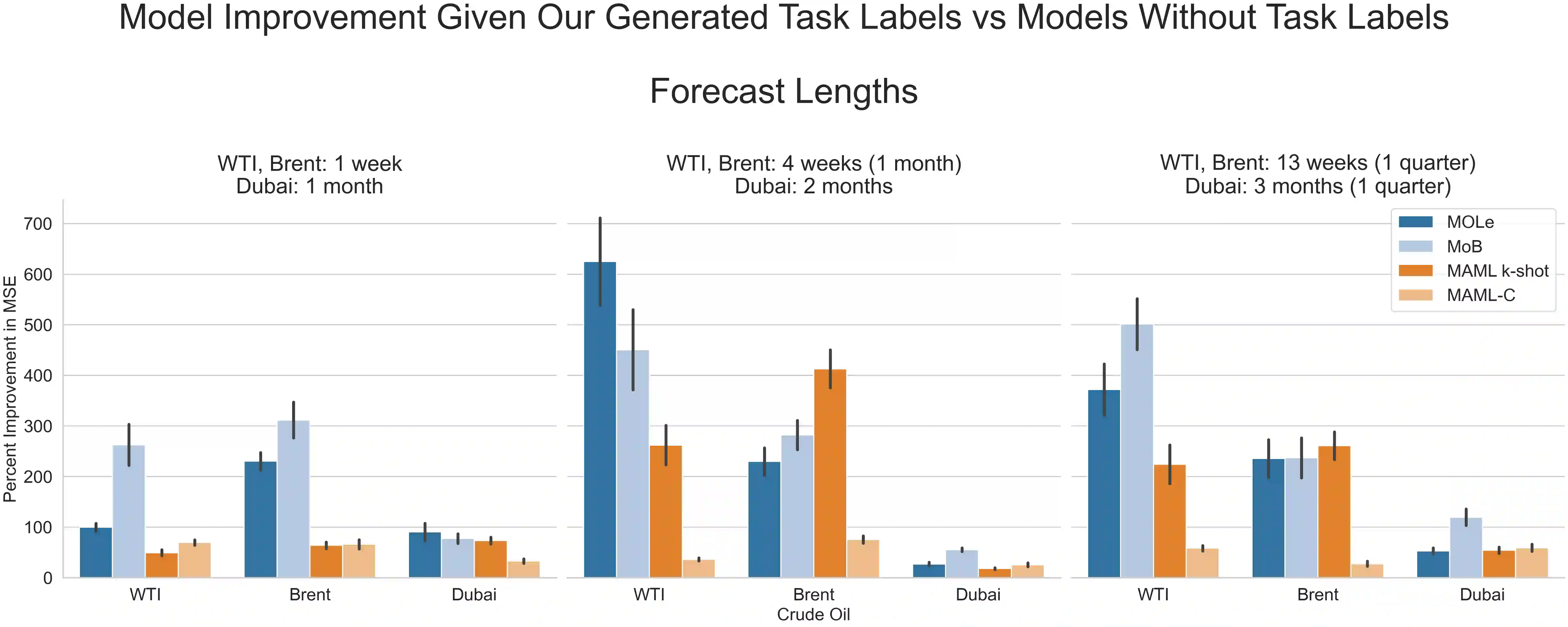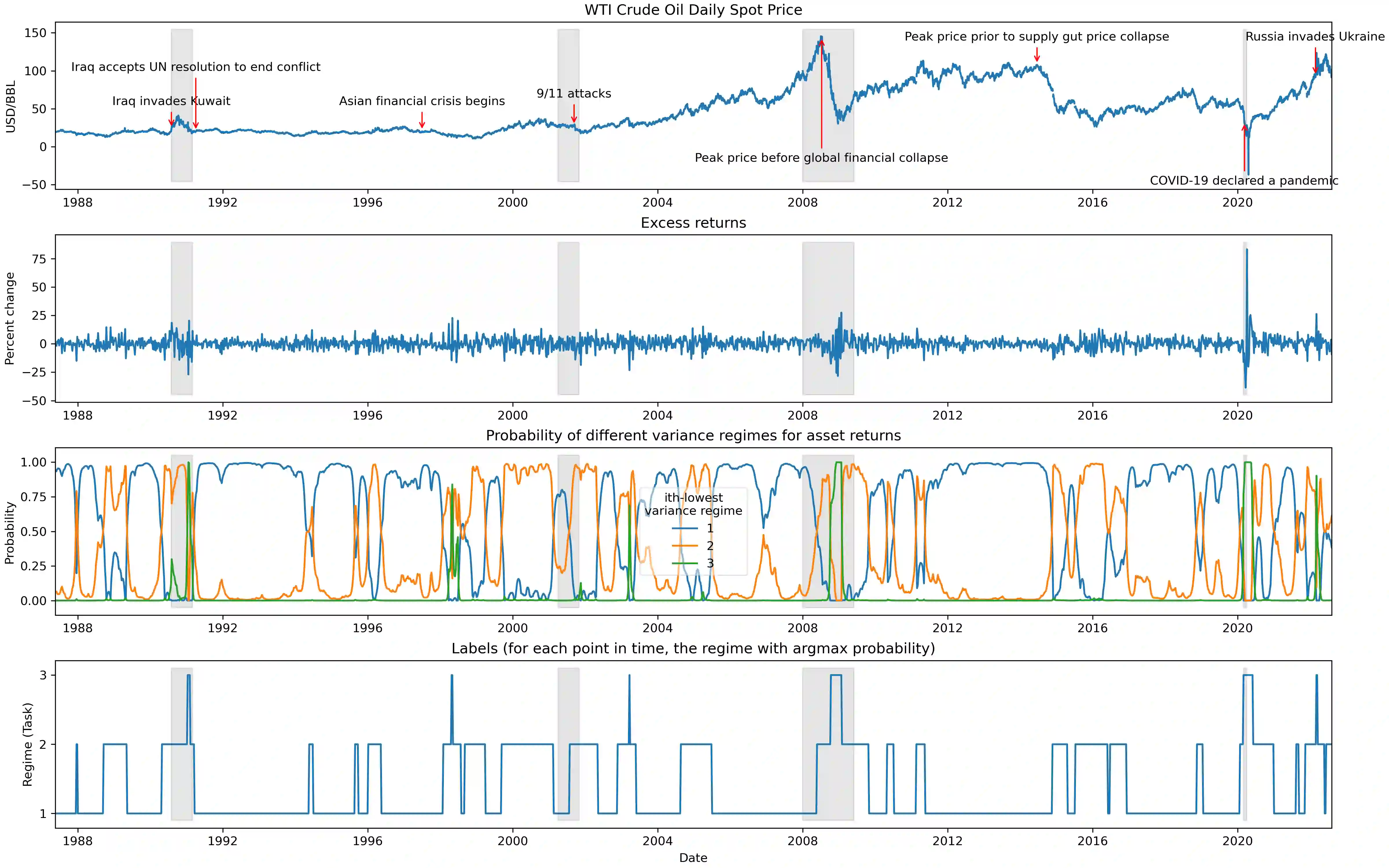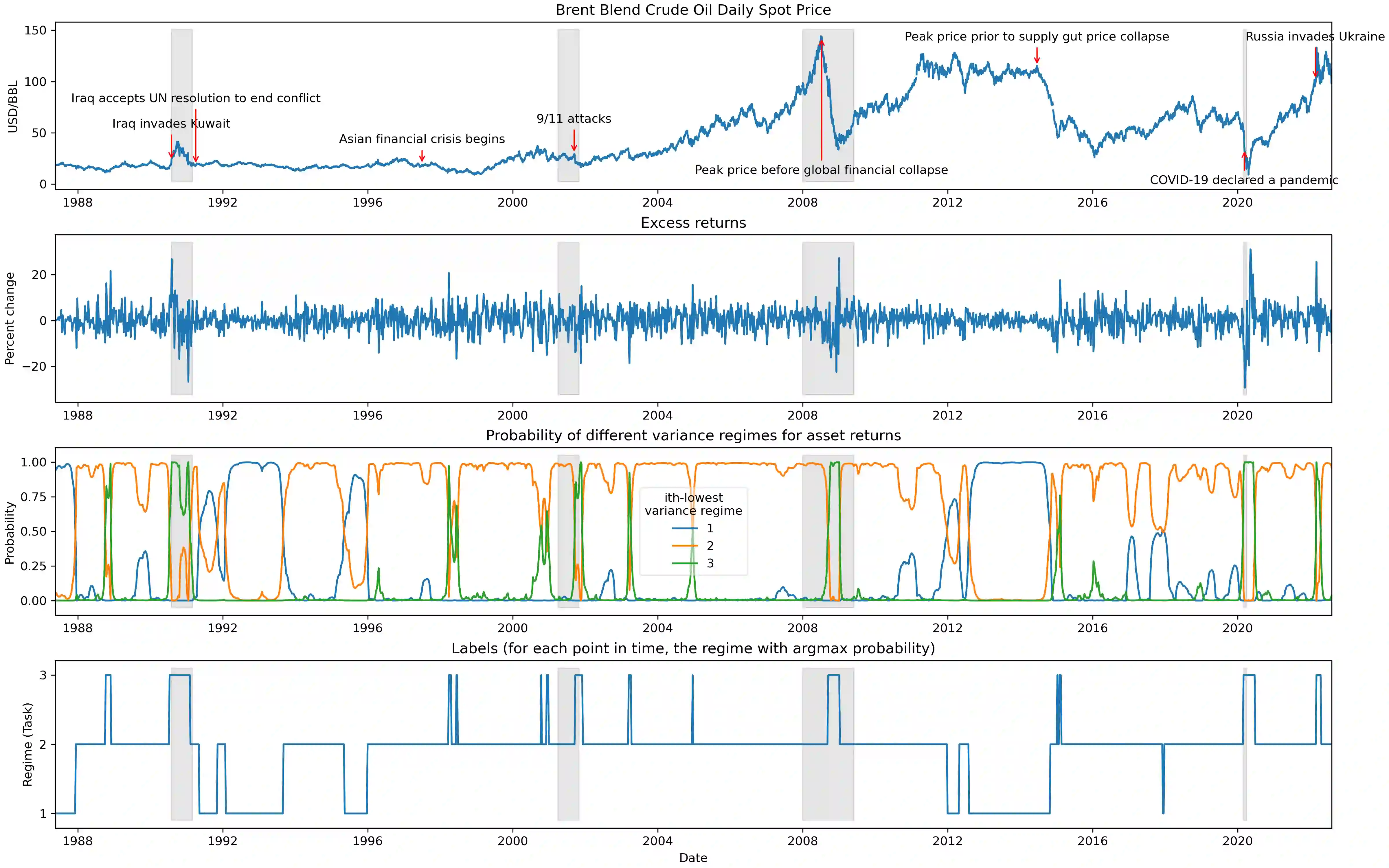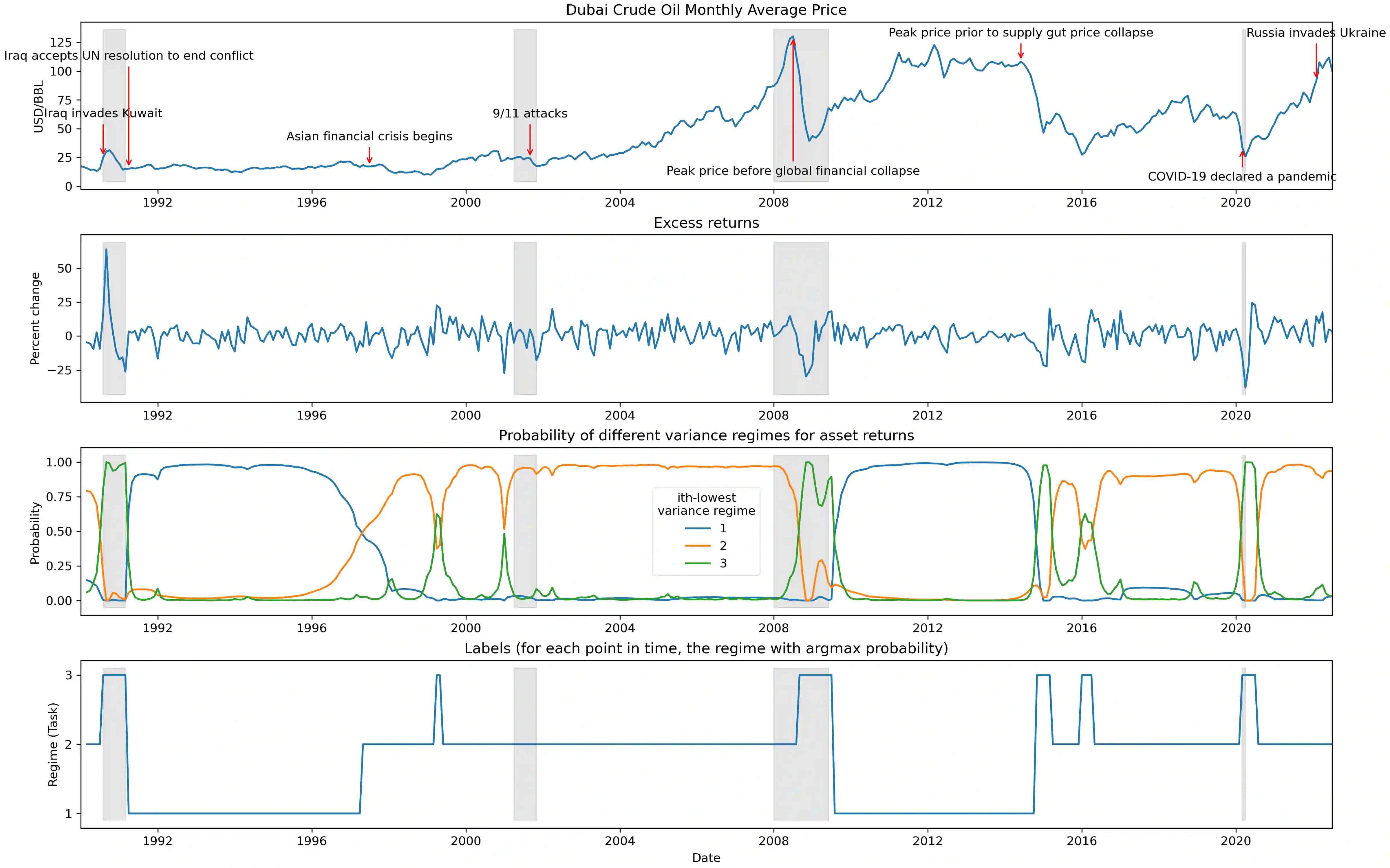 The scarcity of task-labeled time-series benchmarks in the financial domain hinders progress in continual learning. Addressing this deficit would foster innovation in this area. Therefore, we present COB, Crude Oil Benchmark datasets. COB includes 30 years of asset prices that exhibit significant distribution shifts and optimally generates corresponding task (i.e., regime) labels based on these distribution shifts for the three most important crude oils in the world. Our contributions include creating real-world benchmark datasets by transforming asset price data into volatility proxies, fitting models using expectation-maximization (EM), generating contextual task labels that align with real-world events, and providing these labels as well as the general algorithm to the public. We show that the inclusion of these task labels universally improves performance on four continual learning algorithms, some state-of-the-art, over multiple forecasting horizons. We hope these benchmarks accelerate research in handling distribution shifts in real-world data, especially due to the global importance of the assets considered. We've made the (1) raw price data, (2) task labels generated by our approach, (3) and code for our algorithm available at https://oilpricebenchmarks.github.io.