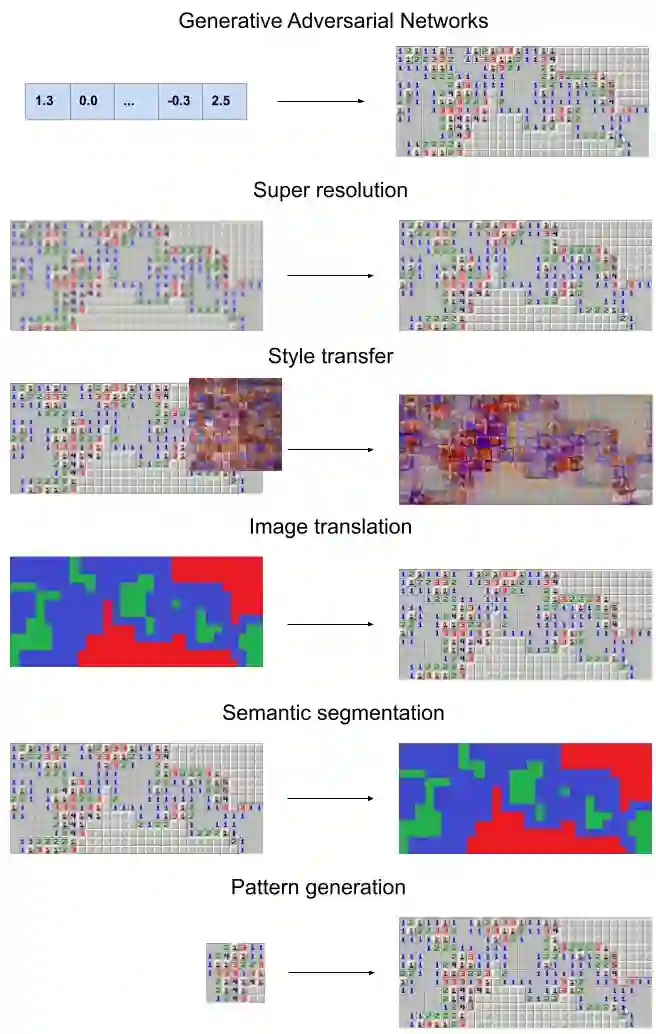 翻译:我们提出了利用深层次学习来创建和提升水平地图和视频游戏(桌面、移动和网络)纹理的实用方法。 我们的目标是为游戏开发者和高级艺术家提供新的可能性。 设计层次和填充细节的任务具有挑战性。 它既耗时,又需要努力使层次丰富、复杂和自然感。 幸运的是, 深层次学习的最近进展为级别设计者和视觉艺术家提供了新的工具。 此外, 深层次学习提供了为游戏再播放和调整教育游戏以适应玩家需要而创造无限世界的方法。 我们提出了七个方法来创建水平地图, 每一个都使用统计方法、 机器学习或深层次学习。 我们特别包括: - 创造层次和填充细节的虚拟Aversarial网络(例如 ProGAN) 。 - 提升图像的超分辨率技术,同时保存精确细节( 如 ESRGANAN) 。 - 用于改变视觉主题的神经样式转换。 - 图像翻译 - 将语系样本地图转换成图像( 如 GaugGAGAANAN ) 。 - 用于将图像转换成磁带图像(例如 ) 。