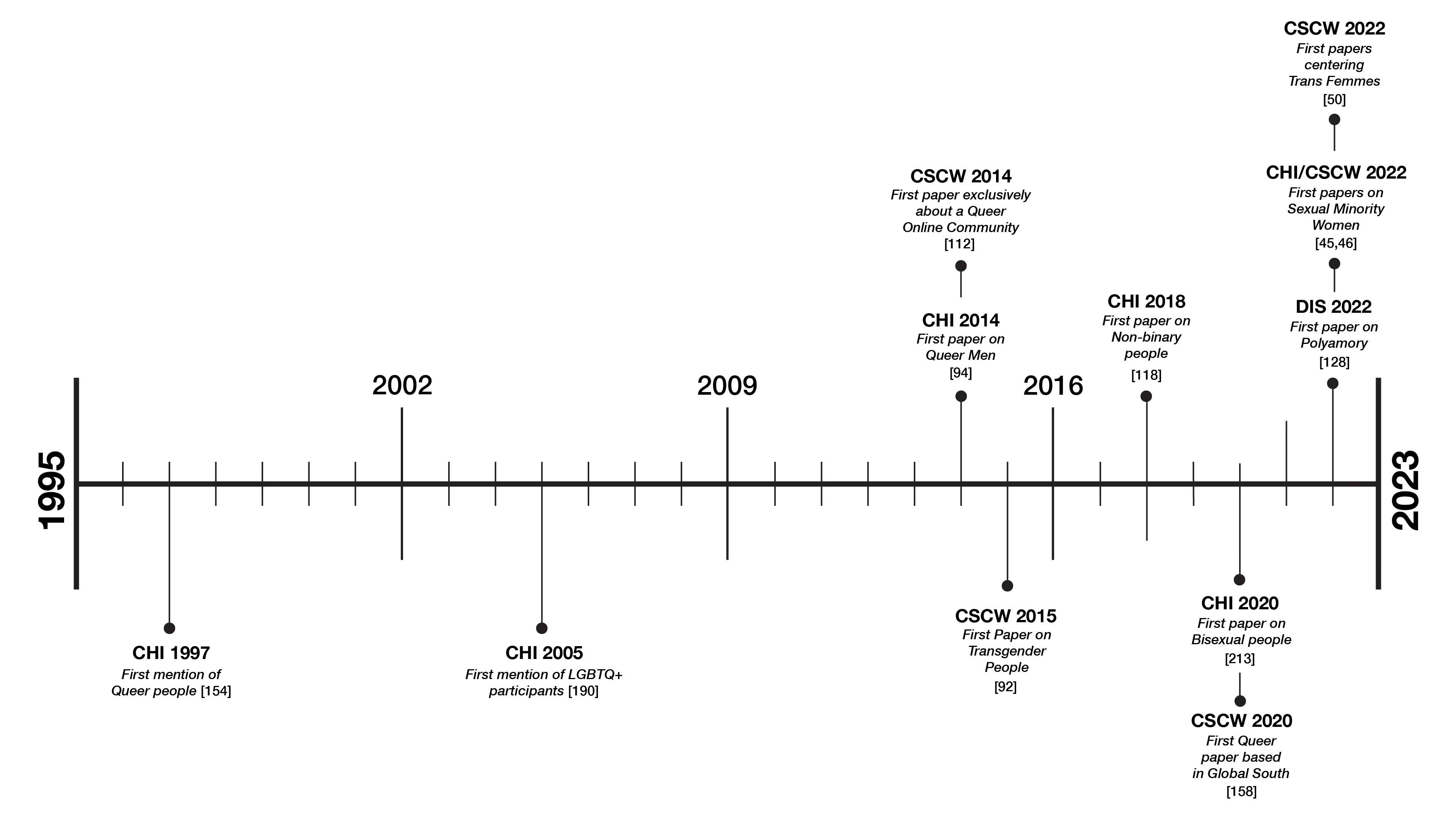 LGBTQ+ people have received increased attention in HCI research, paralleling a greater emphasis on social justice in recent years. However, there has not been a systematic review of how LGBTQ+ people are researched or discussed in HCI. In this work, we review all research mentioning LGBTQ+ people across the HCI venues of CHI, CSCW, DIS, and TOCHI. Since 2014, we find a linear growth in the number of papers substantially about LGBTQ+ people and an exponential increase in the number of mentions. Research about LGBTQ+ people tends to center experiences of being politicized, outside the norm, stigmatized, or highly vulnerable. LGBTQ+ people are typically mentioned as a marginalized group or an area of future research. We identify gaps and opportunities for (1) research about and (2) the discussion of LGBTQ+ in HCI and provide a dataset to facilitate future Queer HCI research.