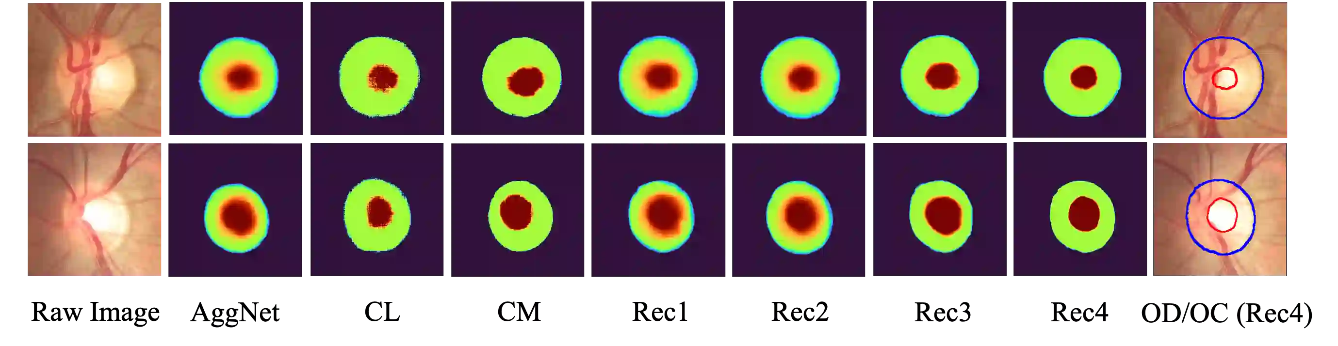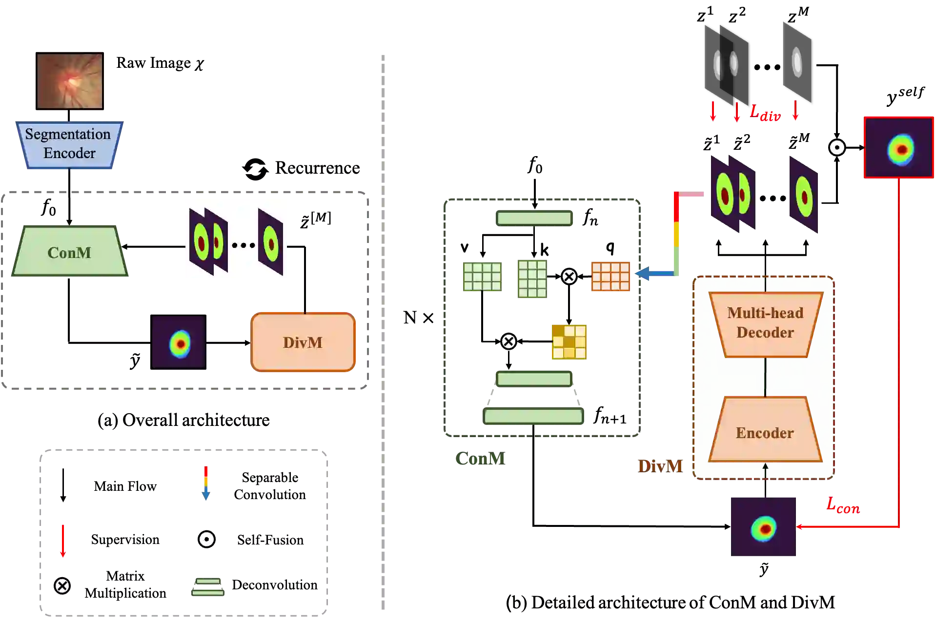 翻译:光碟(OD)和光杯(OC)从 Fundus 图像中分离出来是一项重要的基本任务。 在临床实践中,通常需要收集多位专家的意见,以获得最终的OD/OC批注。这种临床例行做法有助于减轻个人偏差。但是,当数据乘以附加说明时,标准的深层次学习模型将无法适用。在本文件中,我们提议一个新的神经网络框架,以便从多纬度说明中学习OD/OC分解。分解结果通过多纬度专家估计和校准的OD/OC分解的迭接式优化自我校准。在这种方式下,拟议方法可以实现对两个任务的共同改进,并最终获得精细化的分解结果。具体地说,我们提议了差异模型(DivMM)和趋同模型(ConM)分别处理这两项任务。DivM提供的多纬度专家图中的原始图像由DivM生成多纬度专家地图。DivM通过ConM-deal-deal-deal-deal-deal-degrational-mainal-laction abal laction laction raction atraction aclection roglegroduction ablection 由可运行的自动测试结果可以显示为可反复的自我测试结果。