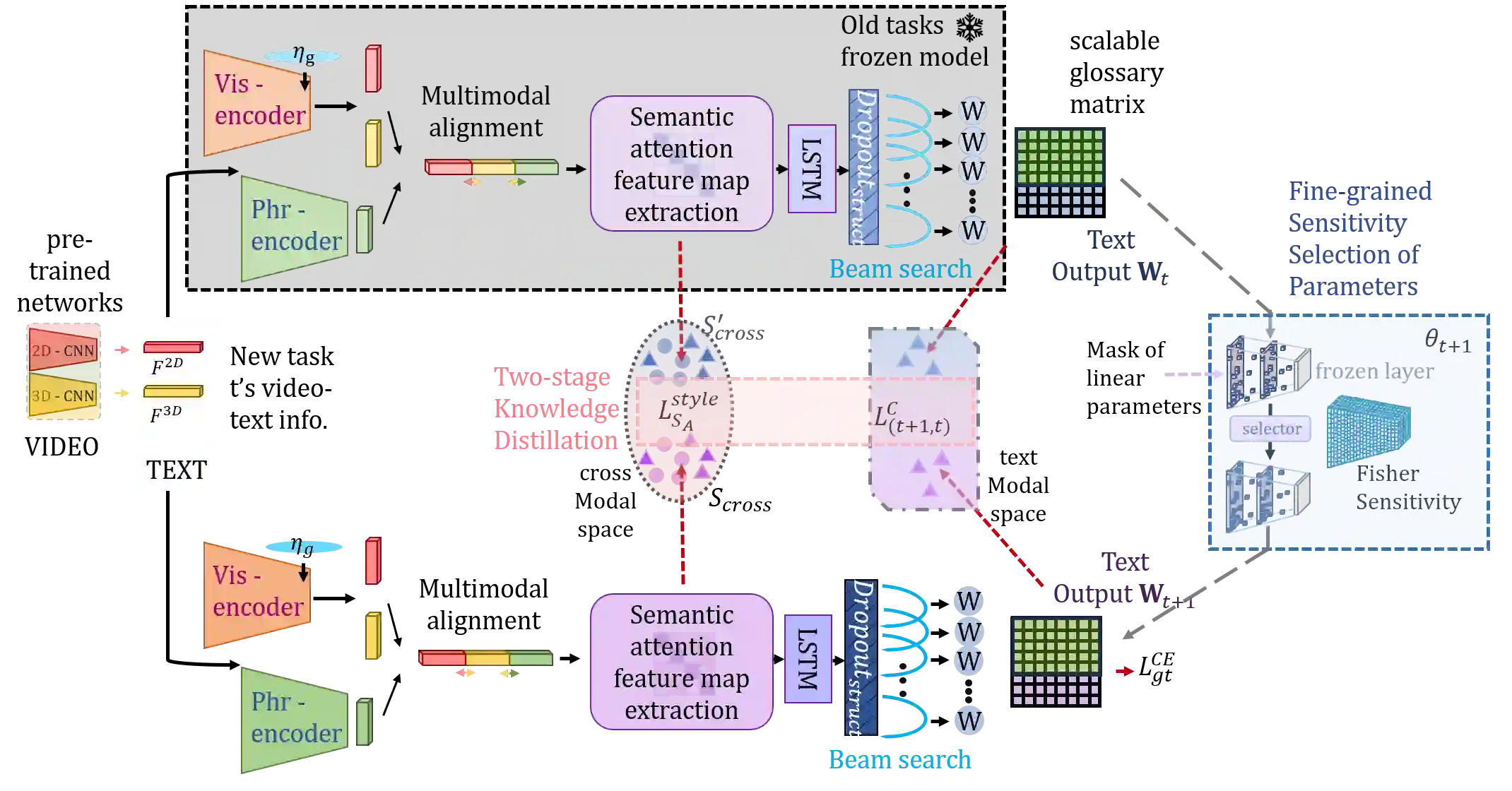 To address the problem of catastrophic forgetting due to the invisibility of old categories in sequential input, existing work based on relatively simple categorization tasks has made some progress. In contrast, video captioning is a more complex task in multimodal scenario, which has not been explored in the field of incremental learning. After identifying this stability-plasticity problem when analyzing video with sequential input, we originally propose a method to Mitigate Catastrophic Forgetting in class-incremental learning for multimodal Video Captioning (MCF-VC). As for effectively maintaining good performance on old tasks at the macro level, we design Fine-grained Sensitivity Selection (FgSS) based on the Mask of Linear's Parameters and Fisher Sensitivity to pick useful knowledge from old tasks. Further, in order to better constrain the knowledge characteristics of old and new tasks at the specific feature level, we have created the Two-stage Knowledge Distillation (TsKD), which is able to learn the new task well while weighing the old task. Specifically, we design two distillation losses, which constrain the cross modal semantic information of semantic attention feature map and the textual information of the final outputs respectively, so that the inter-model and intra-model stylized knowledge of the old class is retained while learning the new class. In order to illustrate the ability of our model to resist forgetting, we designed a metric CIDER_t to detect the stage forgetting rate. Our experiments on the public dataset MSR-VTT show that the proposed method significantly resists the forgetting of previous tasks without replaying old samples, and performs well on the new task.