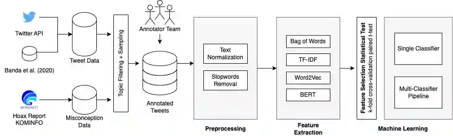 翻译:自2020年初以来,COVID-19大流行给全球造成了巨大的影响,这给社会带来了许多混乱,特别是由于通过社交媒体传播错误信息。虽然已经进行了若干项研究,涉及在社交媒体数据中发现错误信息,但大多数研究都集中在英语数据集上。关于印度尼西亚COVID-19错误信息检测的研究仍然稀缺。因此,通过这项研究,我们收集了印度尼西亚的COVID-19大流行数据集并做了注释,并建立了探测COVID-19错误信息的预测模型。数据集的构建是由一组贴上推文数据相关性和错误信息的告示员组成的团队进行的。在本研究中,我们提出了使用IndoBERT预先培训的语言模型进行两阶段分类模型,用于Tweet错误检测任务。我们还试验了其他一些文本分类基准模型。实验结果显示,将相关预测的BERT序列分类器和用于识别错误信息的Bi-LSTM组合,比其他机器学习模型精确度高87.02 %。总体来说,BERTERP的利用有助于大多数预测模型的更高性表现。我们发布了高品质的CVI-D号之间的协议。我们在印度尼西亚高质量的TRIDAD号之间协议。