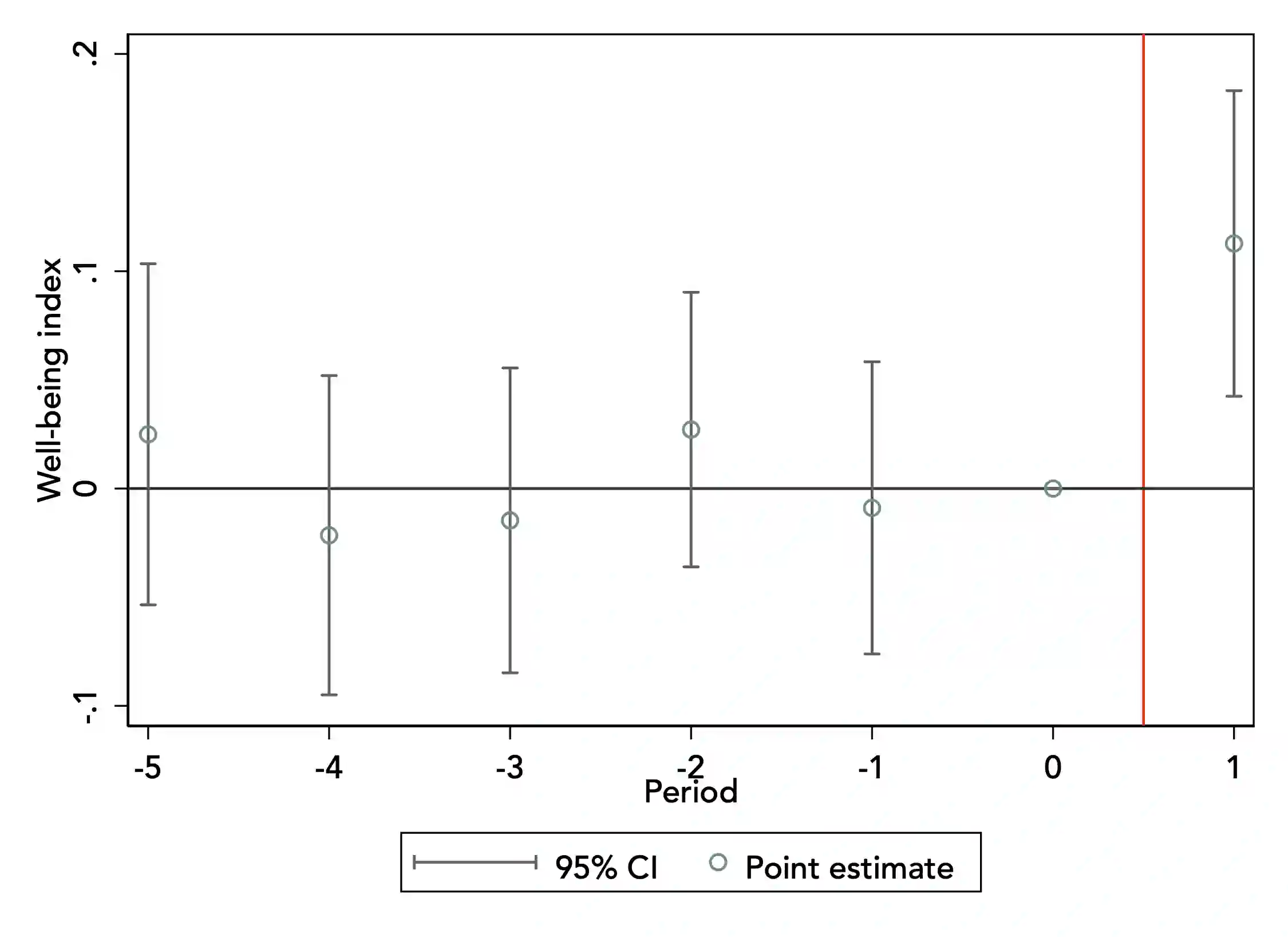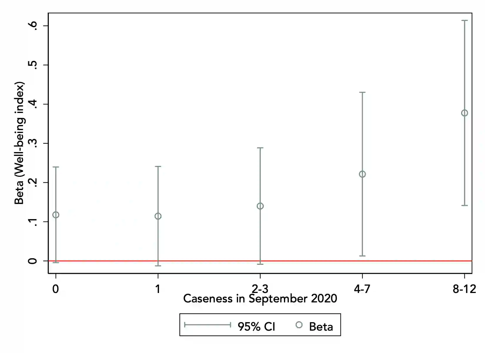 翻译:利用联合王国人口大规模小组调查代表提供的资料,我们量化了COVID-19疫苗对心理健康的影响。利用疫苗接种时间的外在差异,我们发现疫苗接种增加了心理健康(GHQ-12),标准偏差为0.12(GHQ-12),弥补了该流行病造成的总体减少的一半左右。这一影响至少持续了两个月,这与人们所察觉的签订COVID-19的可能性降低以及更多参与社会活动有关。对于精神受困者而言,改进幅度是1.5倍,支持在疫苗接种推广中优先考虑这一群体。