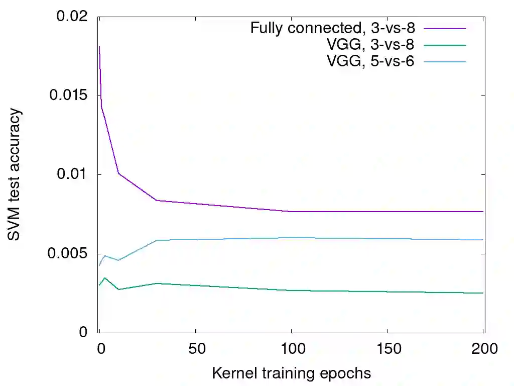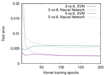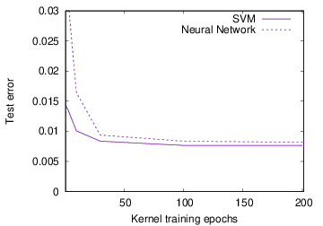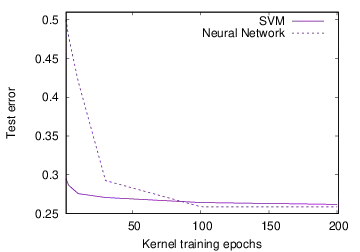 The Neural Tangent Kernel (NTK) is the wide-network limit of a kernel defined using neural networks at initialization, whose embedding is the gradient of the output of the network with respect to its parameters. We study the "after kernel", which is defined using the same embedding, except after training, for neural networks with standard architectures, on binary classification problems extracted from MNIST and CIFAR-10, trained using SGD in a standard way. For some dataset-architecture pairs, after a few epochs of neural network training, a hard-margin SVM using the network's after kernel is much more accurate than when the network's initial kernel is used. For networks with an architecture similar to VGG, the after kernel is more "global", in the sense that it is less invariant to transformations of input images that disrupt the global structure of the image while leaving the local statistics largely intact. For fully connected networks, the after kernel is less global in this sense. The after kernel tends to be more invariant to small shifts, rotations and zooms; data augmentation does not improve these invariances. The (finite approximation to the) conjugate kernel, obtained using the last layer of hidden nodes, sometimes, but not always, provides a good approximation to the NTK and the after kernel.