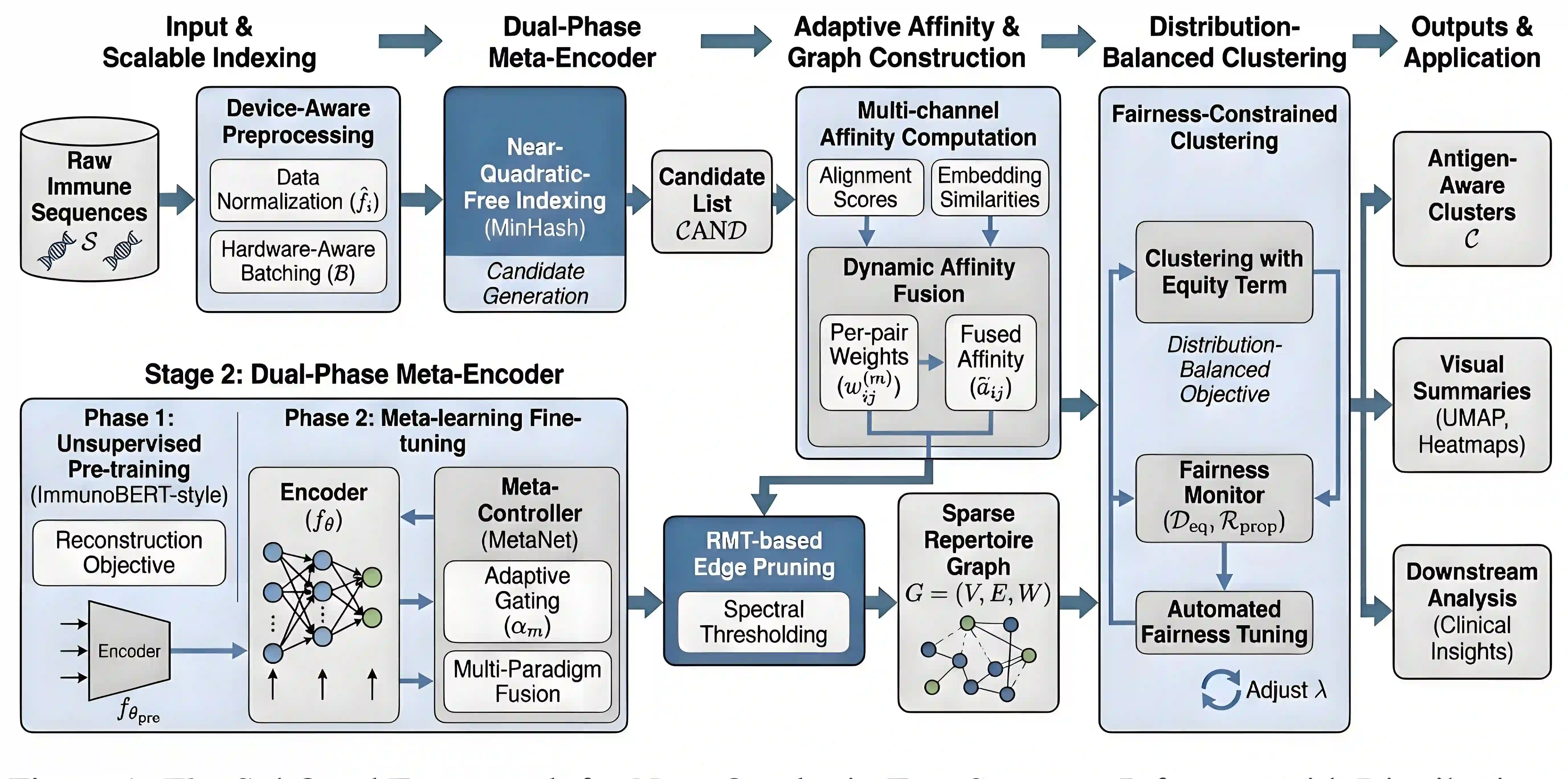 翻译:群体规模适应性免疫库的比较分析受到两个实际瓶颈的限制:成对亲和力评估的近二次方计算成本以及掩盖临床重要少数克隆型的数据集不平衡性。我们提出SubQuad,一种端到端流程,通过结合抗原感知的近次二次方检索、GPU加速的亲和力核函数、学习的多模态融合以及公平约束聚类来解决这些挑战。该系统采用紧凑的MinHash预过滤显著减少候选比较,通过可微分门控模块自适应地按对加权互补的比对和嵌入通道,并采用自动化校准程序确保稀有抗原特异性亚群的比例代表性。在大型病毒和肿瘤库上,SubQuad实现了吞吐量和峰值内存使用率的显著提升,同时保持或改进了召回率@k、聚类纯度及亚群公平性。通过协同设计索引、相似性融合和公平感知目标,SubQuad为库挖掘及下游转化任务(如疫苗靶点优先级排序和生物标志物发现)提供了一个可扩展的、偏差感知的平台。
