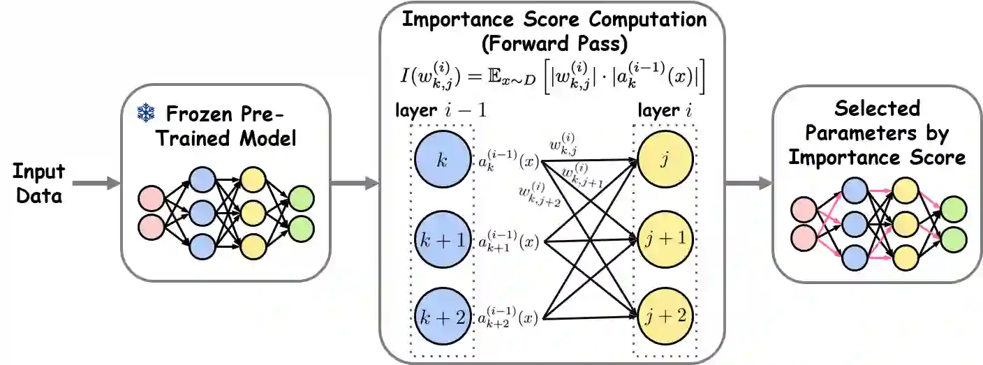 翻译:参数高效微调已成为将大规模预训练模型适配至下游任务的关键策略,但现有方法存在显著局限性。基于添加的方法(如适配器[1])会引入推理延迟与工程复杂度,而基于选择的方法(如基于梯度的参数选择[2])需执行完整反向传播,导致峰值内存占用与全参数微调相同。为解决这一困境,我们提出基于前馈的参数选择方法,这是一种无需梯度的单次前向传播参数优选方案。FPS通过参数幅值与其对应输入激活值的乘积对参数排序,同时利用预训练知识与下游数据。在FGVC和VTAB-1k的24个视觉任务评估中,FPS在保持与前沿方法相当性能的同时,将峰值内存占用降低近9倍,参数选择速度提升约2倍,为大规模预训练模型微调提供了真正内存高效且实用的解决方案。