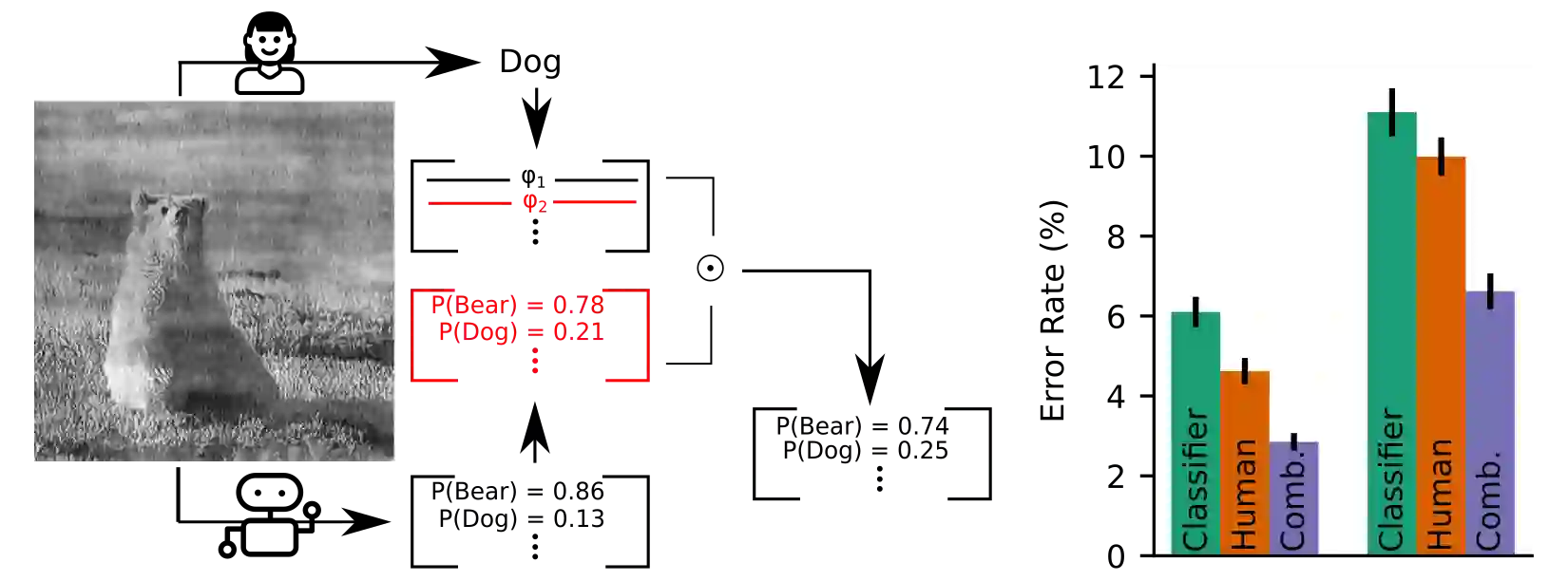 翻译:机器学习模型日益常用的一个案例是提高人类决策者的能力。对于人类或模型都不完全准确的分类任务,获得高性能的一个关键步骤是以利用其相对优势的方式结合个人预测。在这项工作中,我们开发了一套算法,将模型的概率输出与人类的等级输出结合起来。我们从理论上表明,我们的组合模型的准确性不仅取决于个人和模型的精度,而且也取决于模型的自信。关于图像分类的经验性结果与CIFAR-10和图像网络的一个子集表明,这种人类模型组合始终具有比模型或人类本身更高的灵巧性,而且组合方法的参数可以有效估计,只有10个标记的数据点。