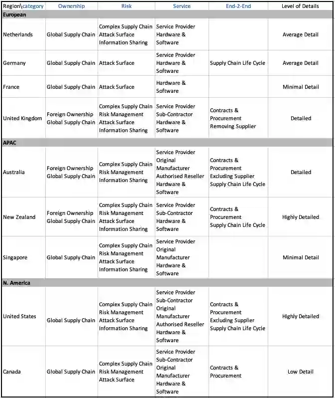 Supply chains are increasingly targeted by threat actors. Using a recent taxonomy, we contrast the diverse levels of detail given by national authorities. The threat is commonly acknowledged, but guidance is disjointed. NIST SP 800-161 aligns closely with the taxonomy and offers a potential pathway towards a common set of principles.