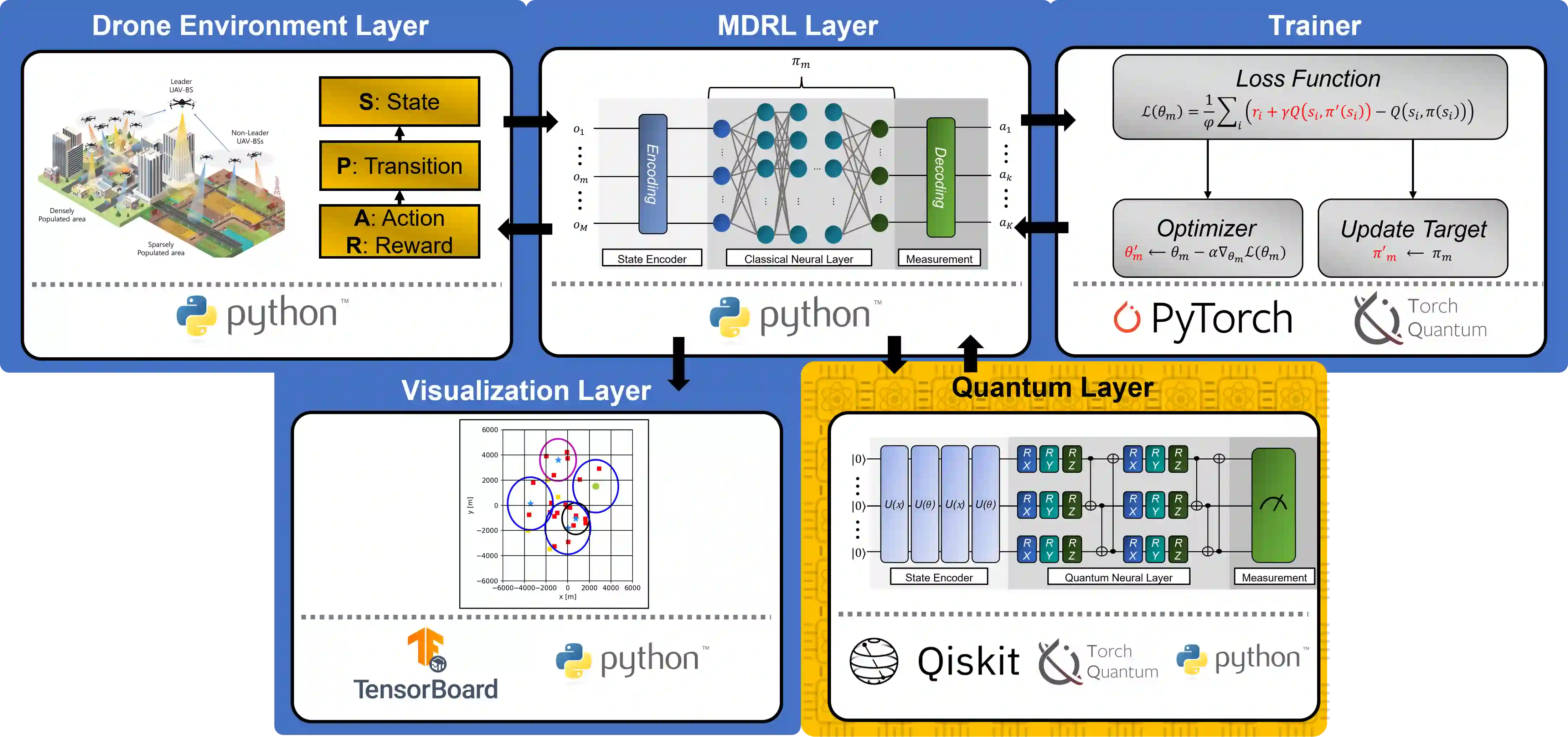 Quantum machine learning (QML) has received a lot of attention according to its light training parameter numbers and speeds; and the advances of QML lead to active research on quantum multi-agent reinforcement learning (QMARL). Existing classical multi-agent reinforcement learning (MARL) features non-stationarity and uncertain properties. Therefore, this paper presents a simulation software framework for novel QMARL to control autonomous multi-drones, i.e., quantum multi-drone reinforcement learning. Our proposed framework accomplishes reasonable reward convergence and service quality performance with fewer trainable parameters. Furthermore, it shows more stable training results. Lastly, our proposed software allows us to analyze the training process and results.