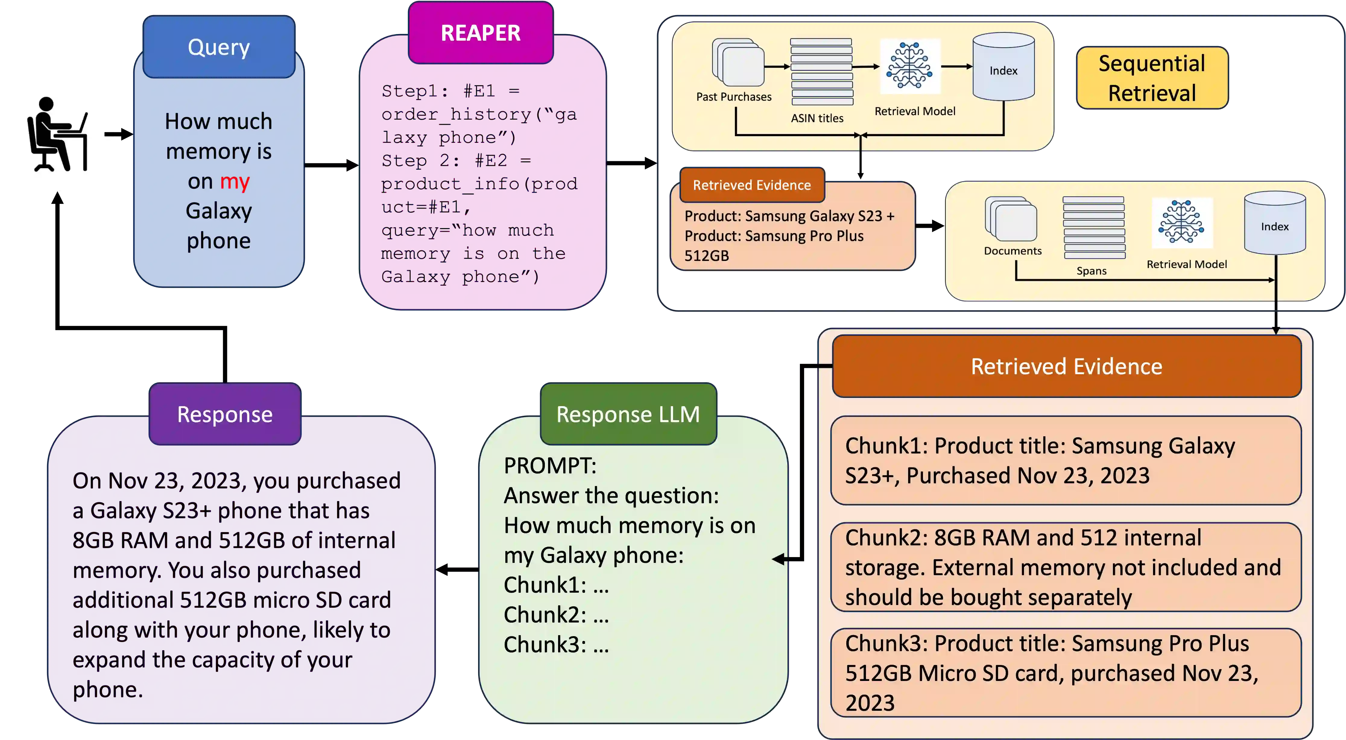 Complex dialog systems often use retrieved evidence to facilitate factual responses. Such RAG (Retrieval Augmented Generation) systems retrieve from massive heterogeneous data stores that are usually architected as multiple indexes or APIs instead of a single monolithic source. For a given query, relevant evidence needs to be retrieved from one or a small subset of possible retrieval sources. Complex queries can even require multi-step retrieval. For example, a conversational agent on a retail site answering customer questions about past orders will need to retrieve the appropriate customer order first and then the evidence relevant to the customer's question in the context of the ordered product. Most RAG Agents handle such Chain-of-Thought (CoT) tasks by interleaving reasoning and retrieval steps. However, each reasoning step directly adds to the latency of the system. For large models this latency cost is significant -- in the order of multiple seconds. Multi-agent systems may classify the query to a single Agent associated with a retrieval source, though this means that a (small) classification model dictates the performance of a large language model. In this work we present REAPER (REAsoning-based PlannER) - an LLM based planner to generate retrieval plans in conversational systems. We show significant gains in latency over Agent-based systems and are able to scale easily to new and unseen use cases as compared to classification-based planning. Though our method can be applied to any RAG system, we show our results in the context of a conversational shopping assistant.